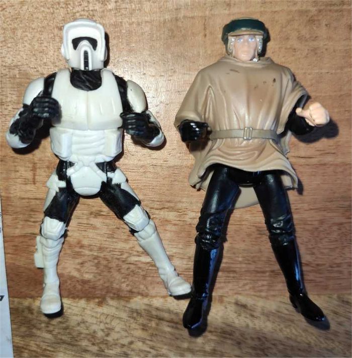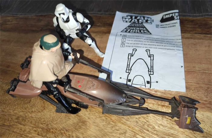 ✨⚔️ Lot Star Wars Star Wars : Épisode VI– Le Retour du Jedi Scènes : course de speeders sur la Lune forestière Endoor - Figurine Luke Skywalker Hauteur debout 9,5 cm Main adaptées pour la conduite du Speeder bike Articulations tête, bras, taille, jambes, genoux - Figurine Stormtrooper Hauteur debout 9,5 cm Main adaptées pour la conduite du Speeder bike Articulations tête, bras, jambes, genoux - Imperial Speeder Bike (1996) + feuille notice 69765.134 KENNER Longueur 20 cm Bouton "éjection" qui explose le Speeder Bike en plusieurs morceaux Idéal pour collectionneur ou fan de Star Wars. Bon état général, vendu tel que présenté sur photos .