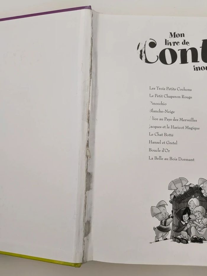 10 grands contes dans un seul livre : Les trois petits cochons Le petit chaperon rouge Pinocchio Blanche-Neige Alice au pays des merveilles Jacques et le haricot magique Le chat botté Hansel et Gretel Boucle d'Or La belle au Bois Dormant Abîmé par le temps sur la tranche et la première page à été scotcher sinon l'intérieur est parfait.