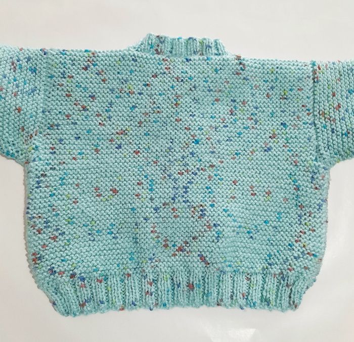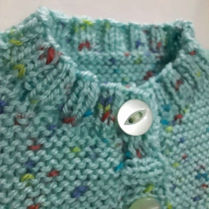Taille Naissance – vert moucheté NEUF - tricoté main Je vous présente un petit gilet tricoté tout au point mousse et en côtes 2/2 sur le bas et les poignets du gilet. Le gilet se ferme sur le devant à l'aide de 5 boutons plats transparents. Le coloris est VERT mais moucheté de bleu et rouge. Laine spéciale Bébé, la Pingorex Baby très douce pour le confort de votre bébé. Mesures du Gilet (normes standard Naissance) :  Largeur épaule  : environ 5,5 cm Largeur partie basse après les côtes  vers le milieu : environ 22 cm   Largeur entre les emmanchures  : environ 19,5 cm  Hauteur jusqu'aux emmanchures  : environ 9,5-10 cm Hauteur des emmanchures aux épaules  : environ 8 cm  Hauteur manches + épaules : environ 19,5 cm  Hauteur totale  : environ 18 cm  Ce modèle a été réalisé avec la laine PINGOREX Baby de  PINGOUIN 100 % acrylique. Lavage à 30°