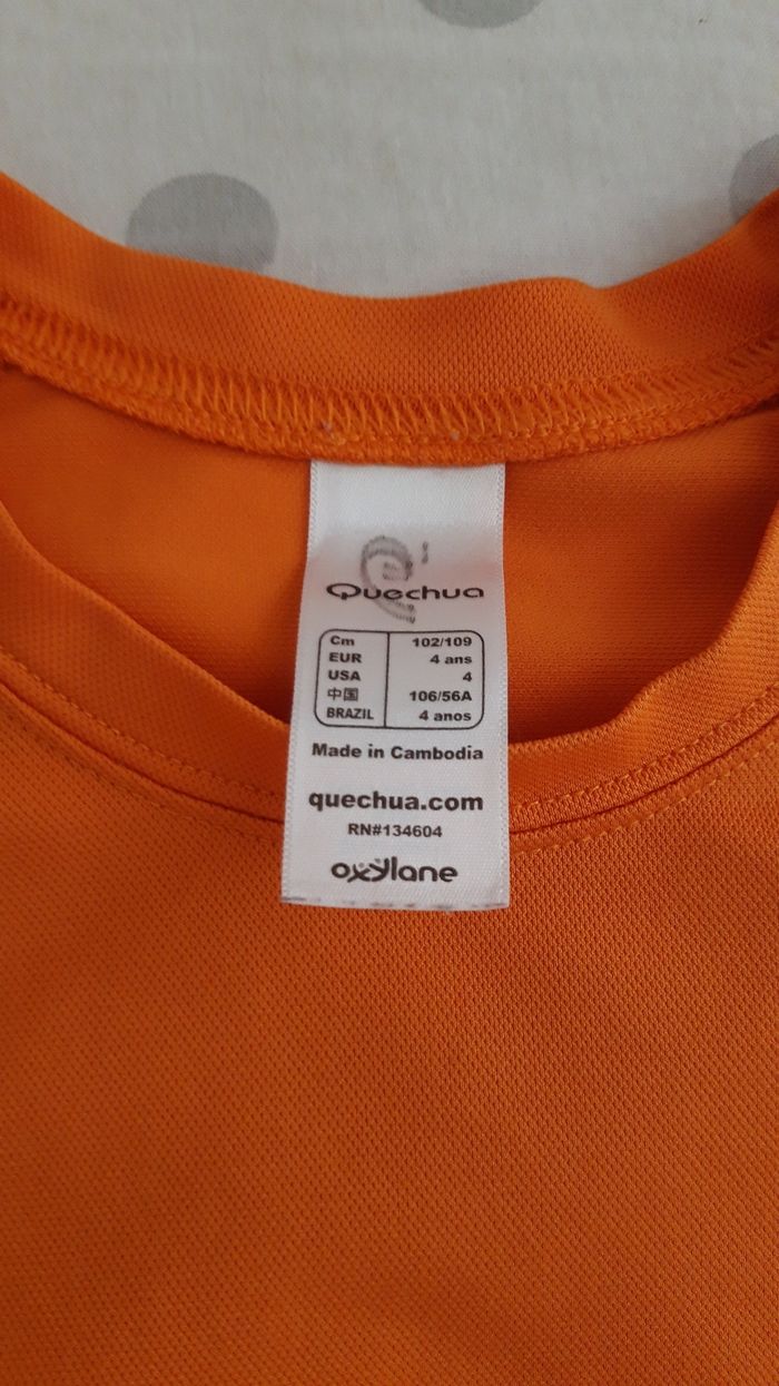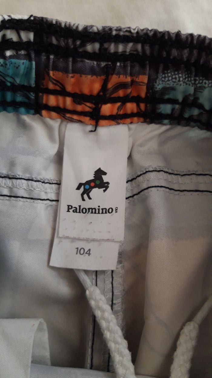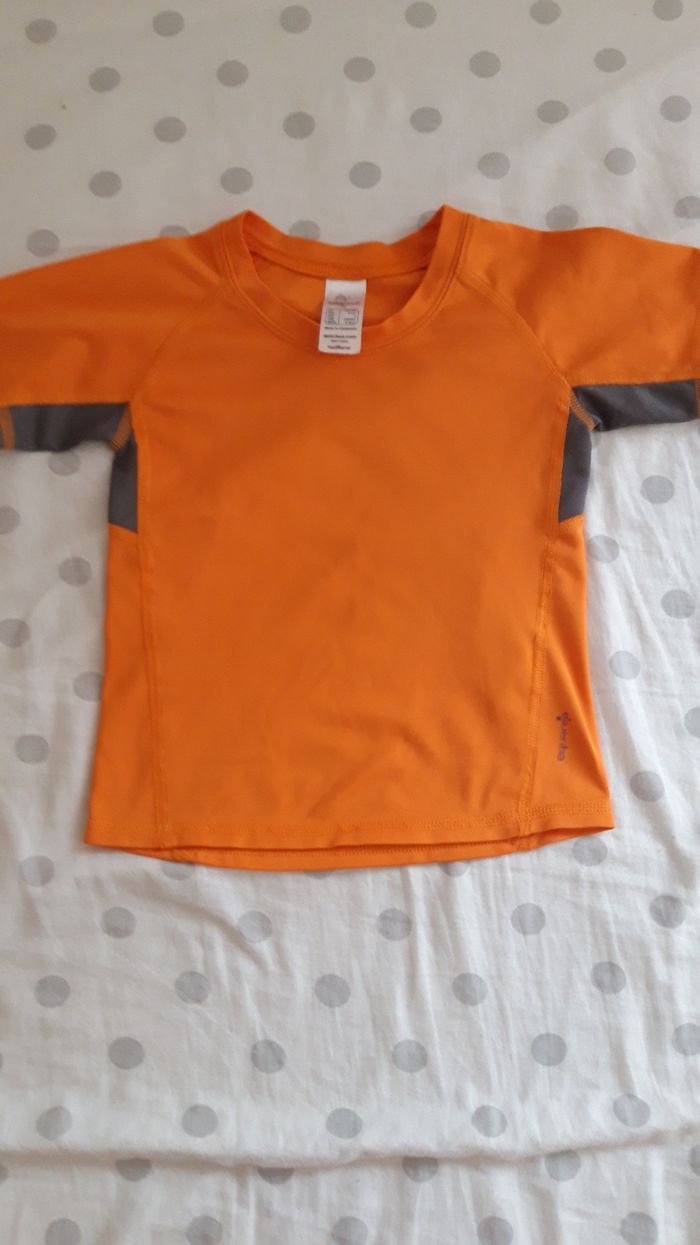 Lot de : 1 short à motifs colorés, légères traces de crayons voir photos de marque Palomino, taille 4 ans, ajustable à la taille avec cordons. 1 t-shirt type sport taille 4 ans de marque Quechua, couleur orange. 1 débardeur gris, taille 4-5 ans (plutôt 4 ans).