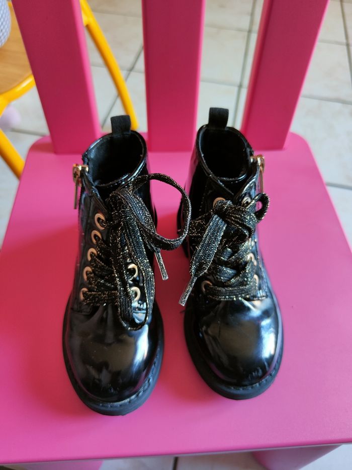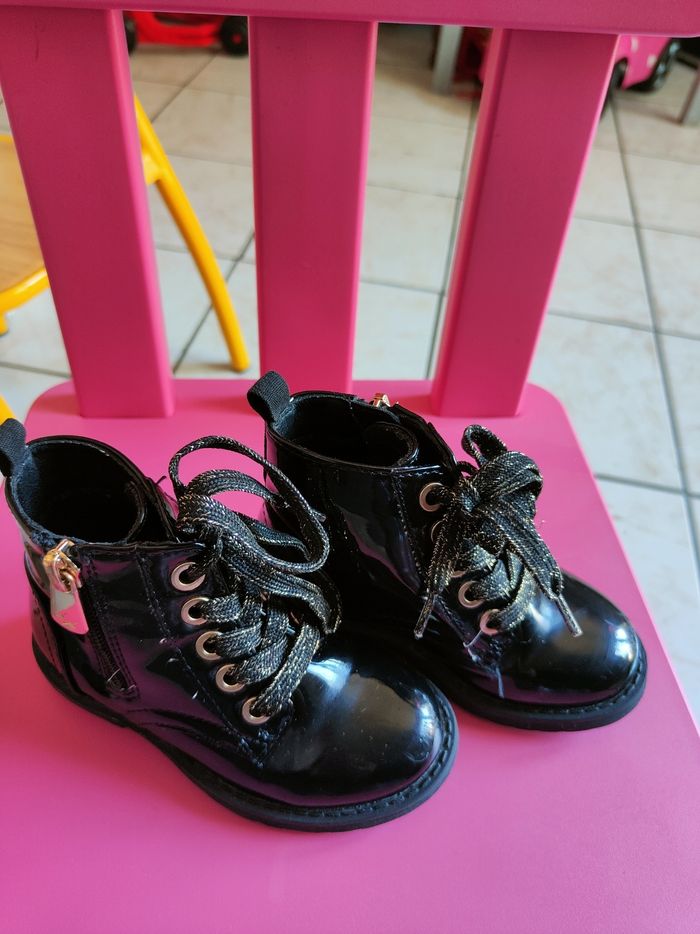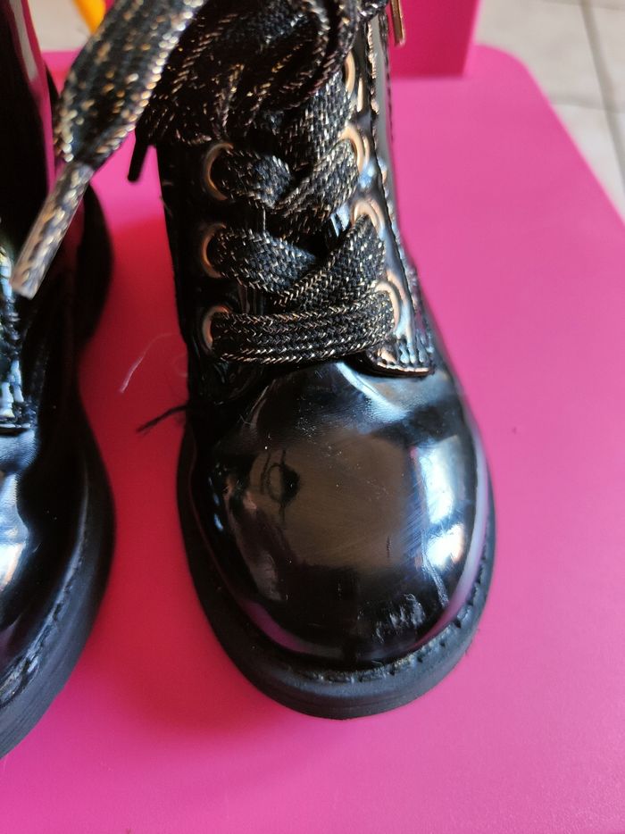 Vends jolie paire de bottines noires vernies en très bon état hormis un accro voir dernière photo mais se voit pas beaucoup N'hésitez pas à faire des lots 🌺 Pointure 23