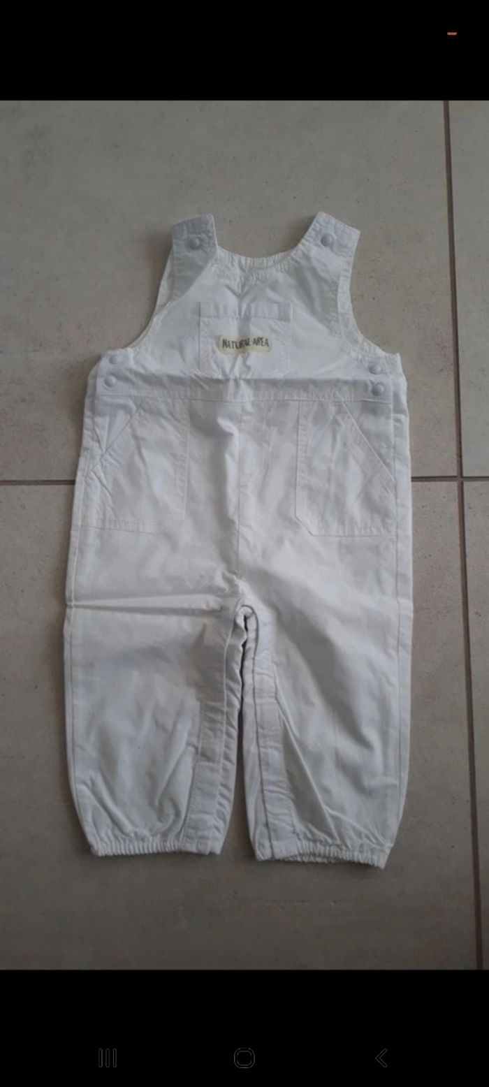 Salopette blanche Pressions entre les jambes, sur les côté et en haut pour accrocher les bretelles. 2 poches devant et 1 poche en haut avec texte Taille 12 mois