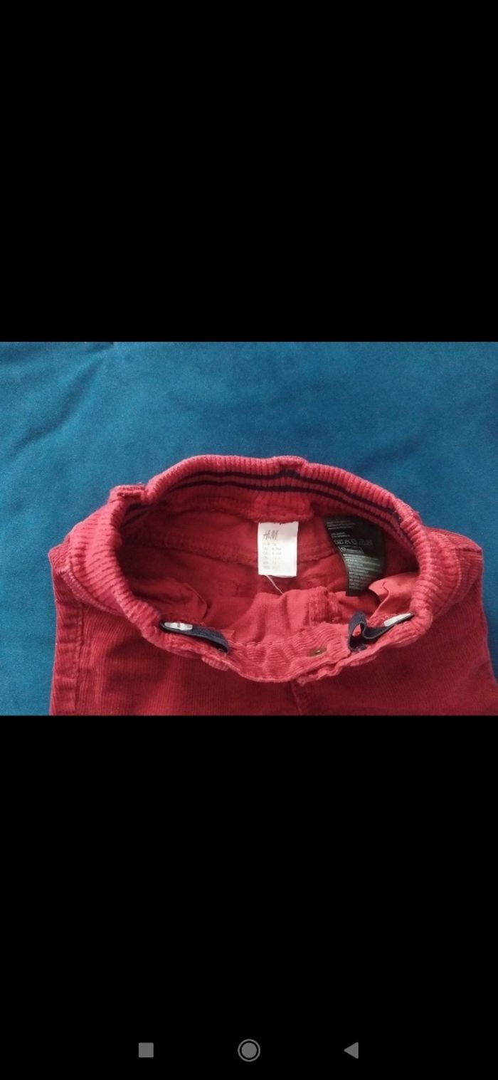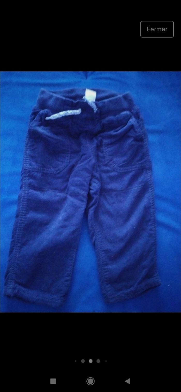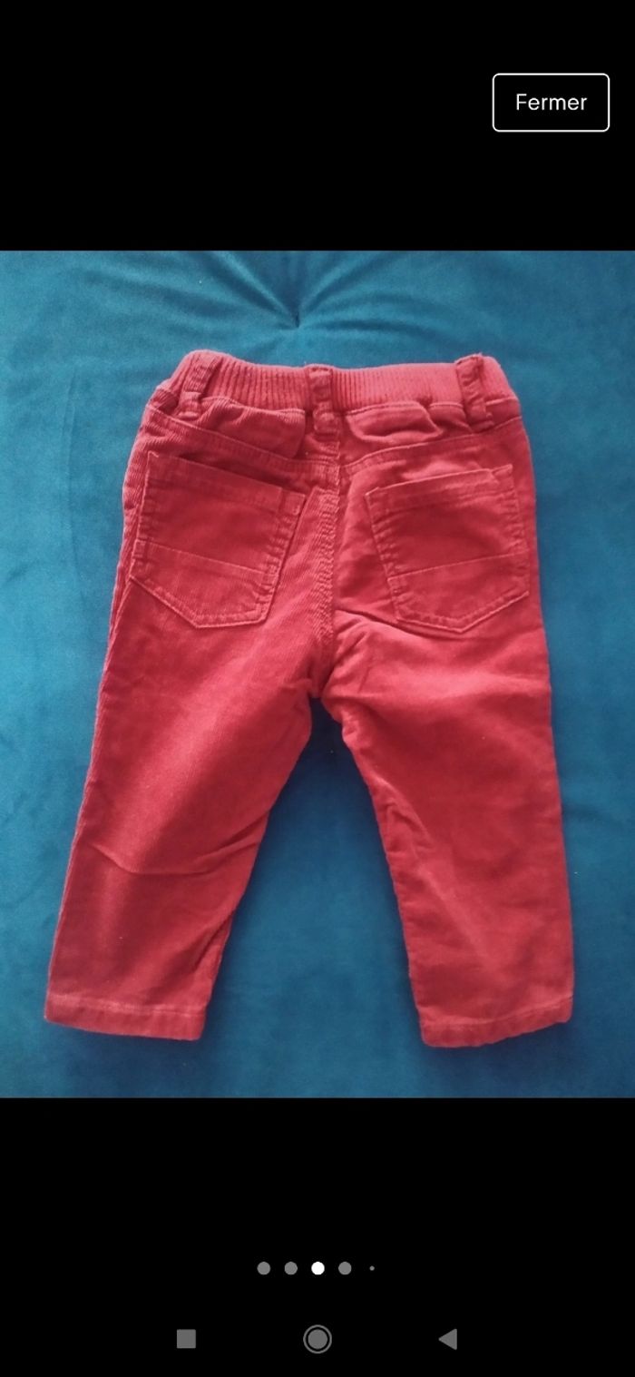 Très bon état. 6-9 mois. Taille 74 cm. 2 pantalons velours H&M. 1 rouge à taille ajustable. 1 bleu marine avec des liens. 1 sweat avec nuage, crayon... Lot à 5€.