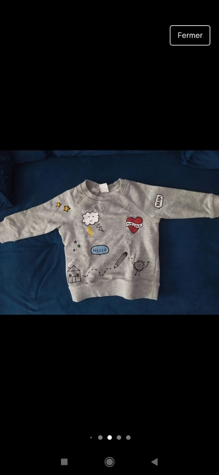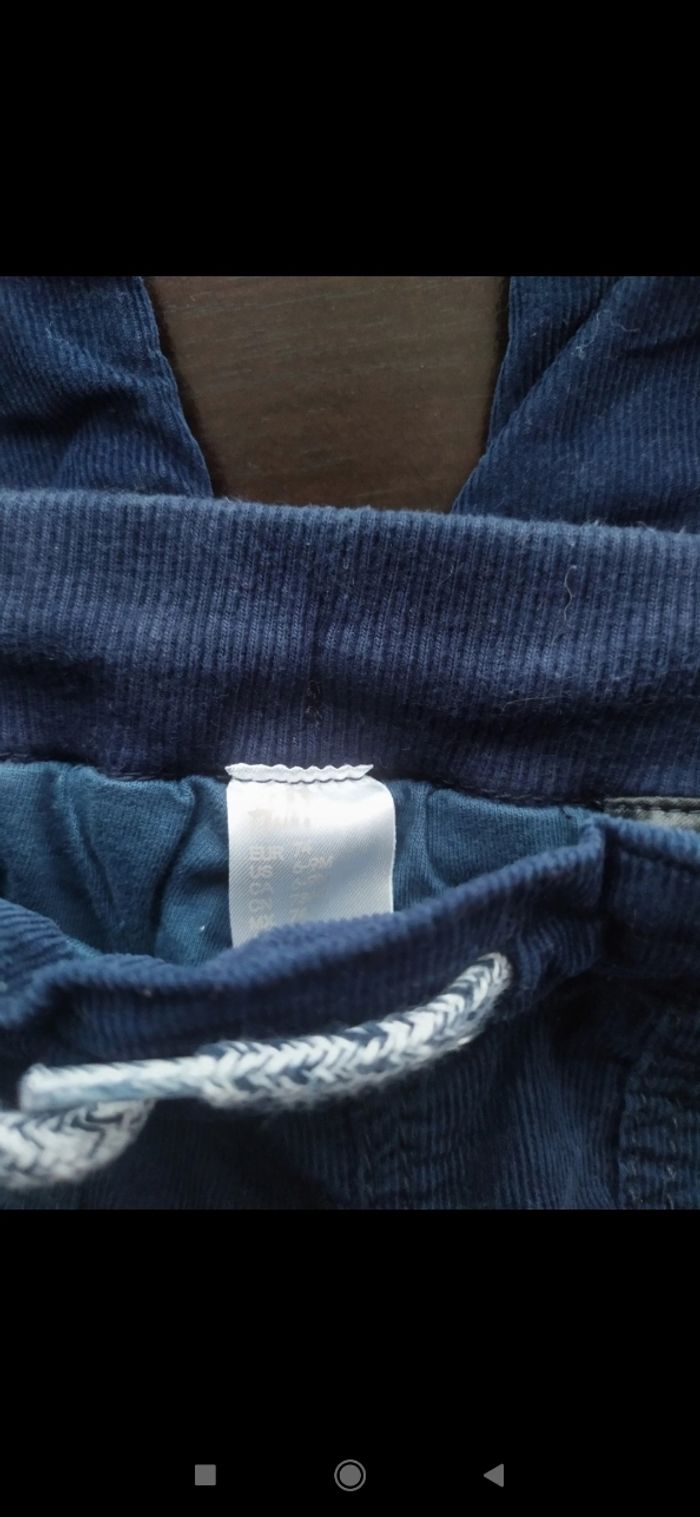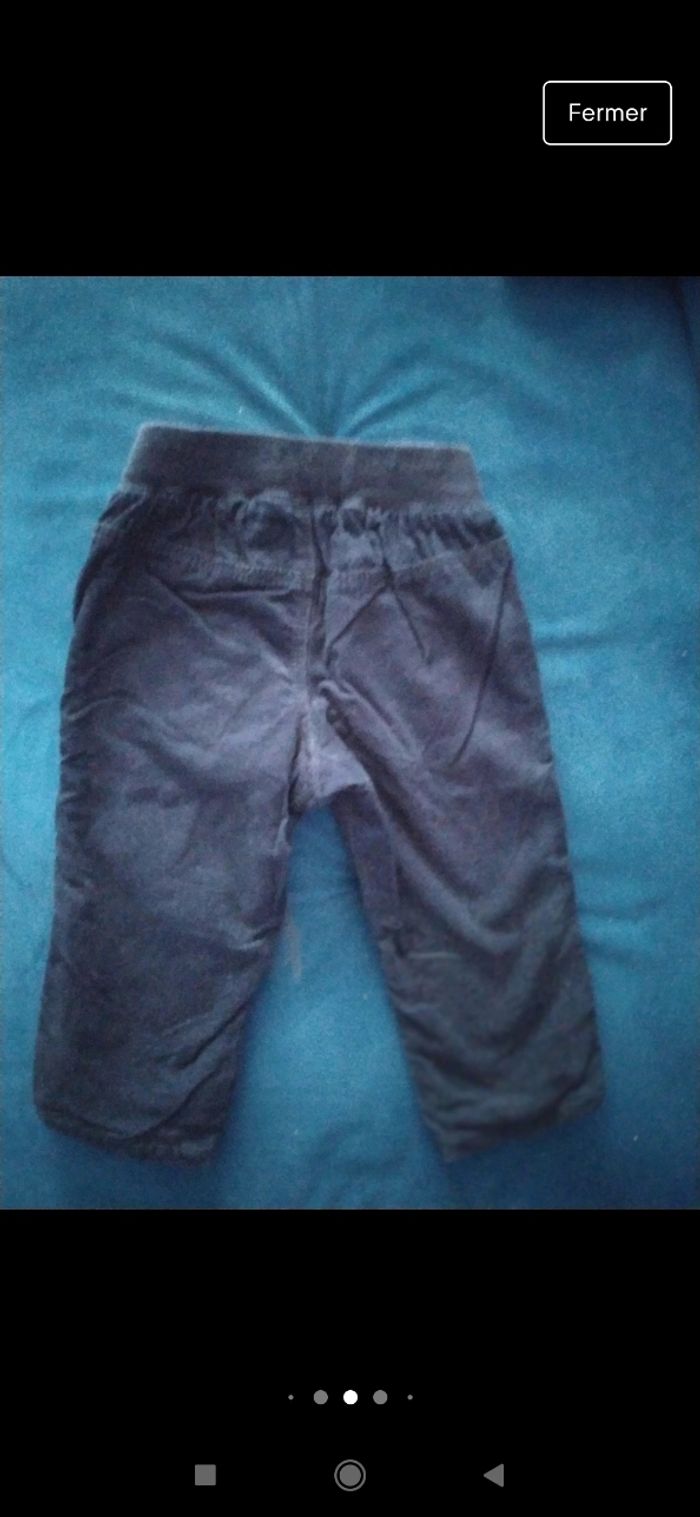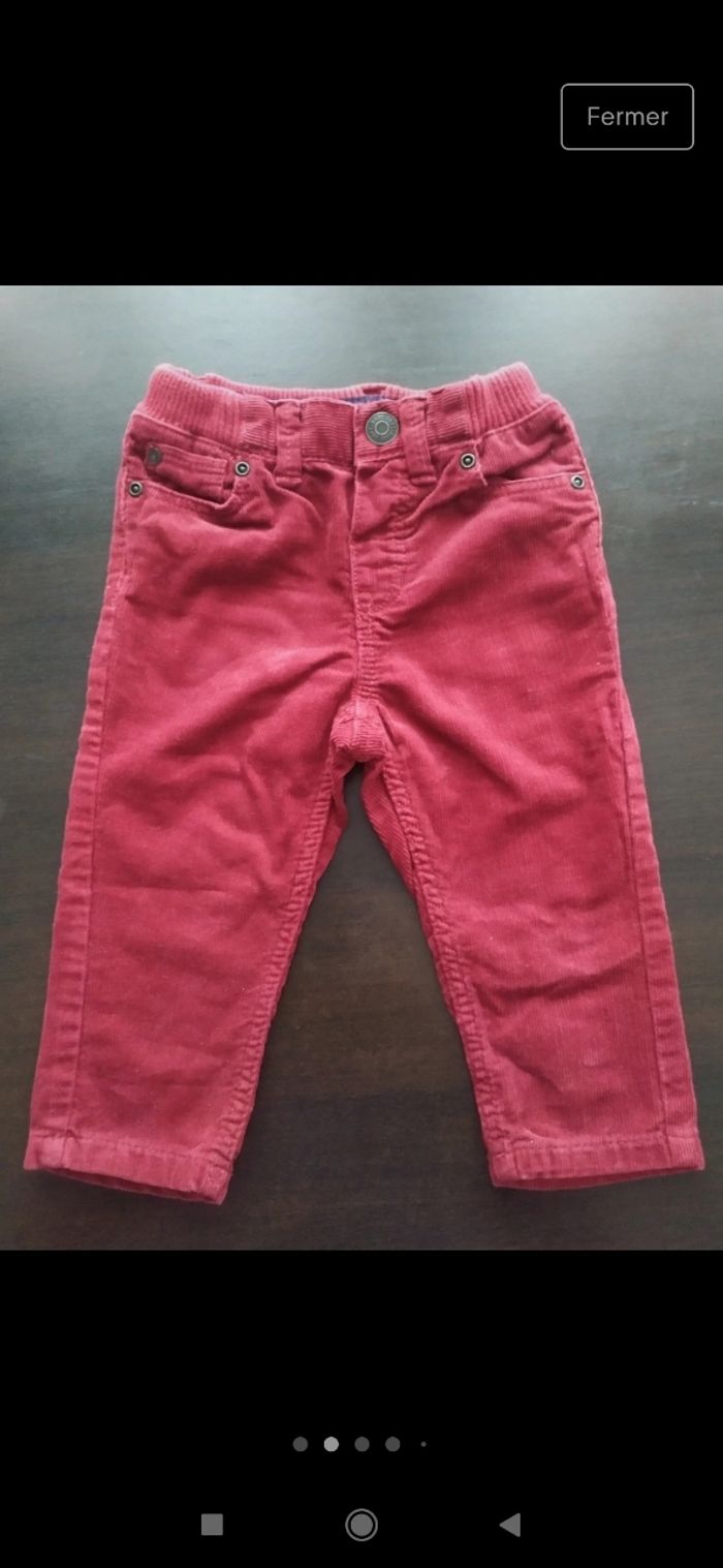 Très bon état. 6-9 mois. Taille 74 cm. 2 pantalons velours H&M. 1 rouge à taille ajustable. 1 bleu marine avec des liens. 1 sweat avec nuage, crayon... Lot à 5€.