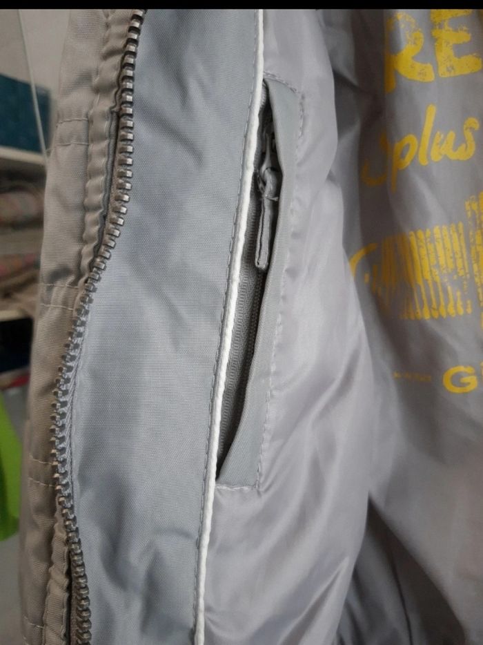 Blouson capuche rétractable, 2 poches intérieures, 2 poches zippees extérieurs. Écriture en jaune used d'origine. Très bon état .seul défaut dernière photo manque un bout de tissu