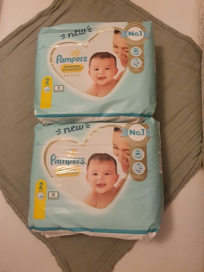 Vends deux paquets de couches neufs pampers taille 2. Le paquet contient 30 couches.