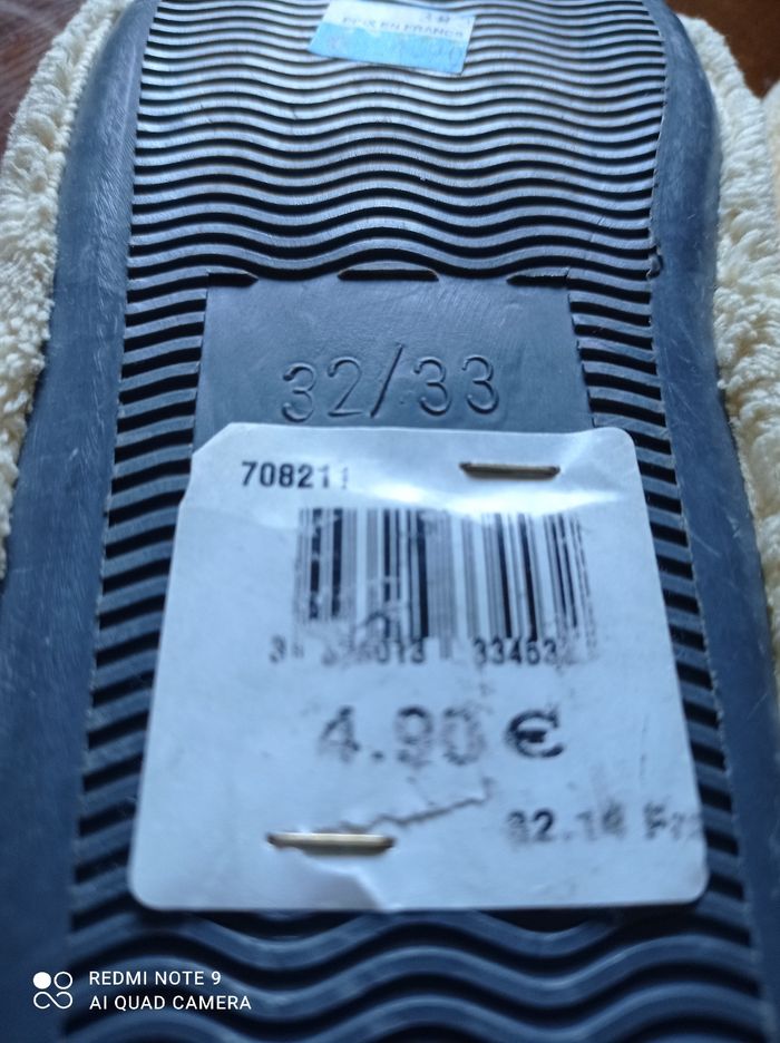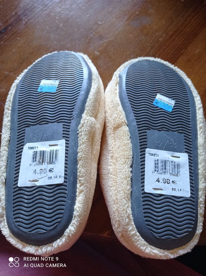 Paire de chaussons neufs. Pointure 32-33. Quelques petites traces noires qui devraient partir au lavage.
