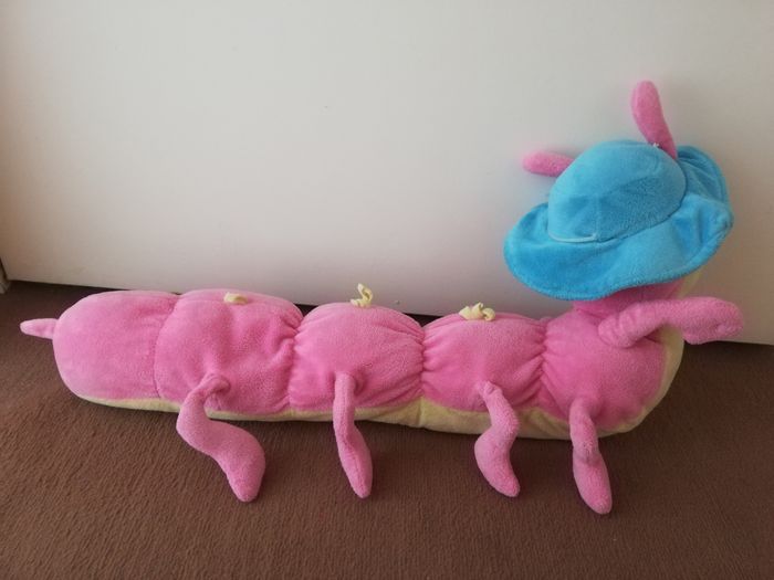 Mille pattes ou chenille. En bon état a part des petits points d'usure. Mesure 60 cms environ et sans étiquette. Très joli, couleur rose et jaune avec son chapeau bleu.