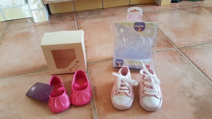 -1 paire de basket taille 0-6mois excellent état. 3€ -1 paire de ballerine taille 15-16 NEUF avec étiquette. 3€