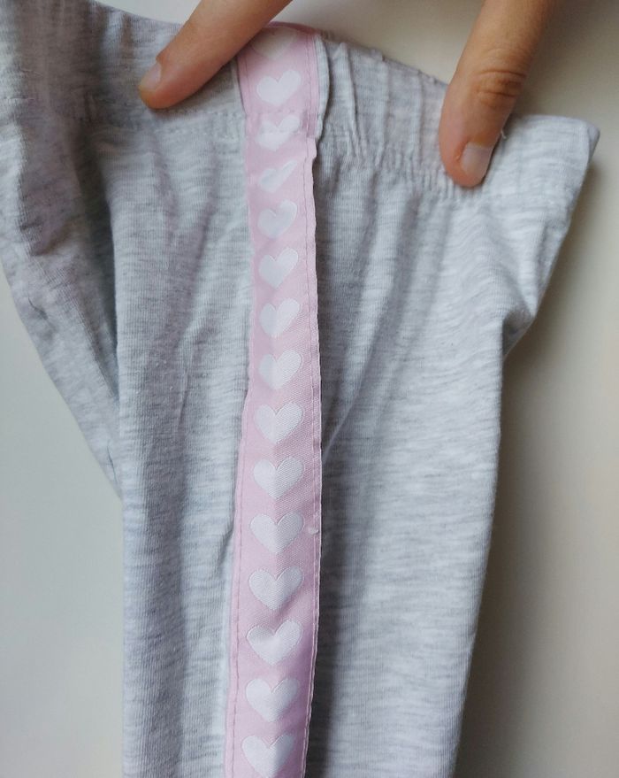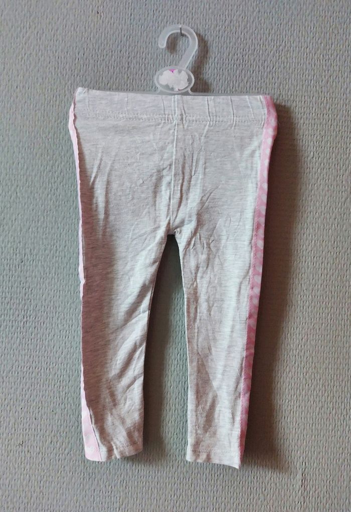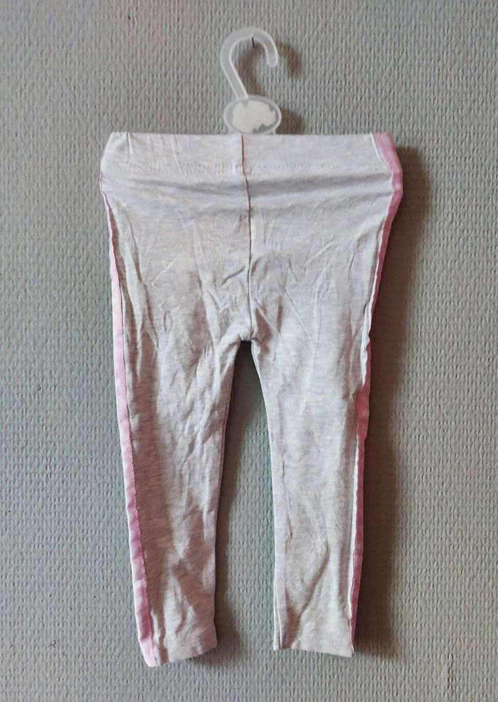 Je vends un legging gris clair avec une bande rose avec des cœurs blanc sur chaque côté venant de chez Trafic. Taille : 74-80 (9-12 mois). Neuf, jamais mis.