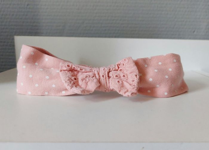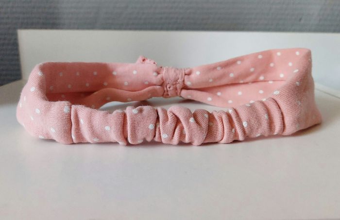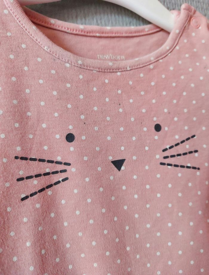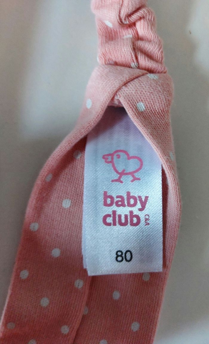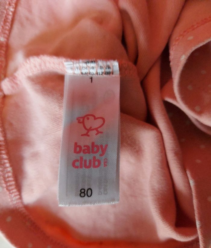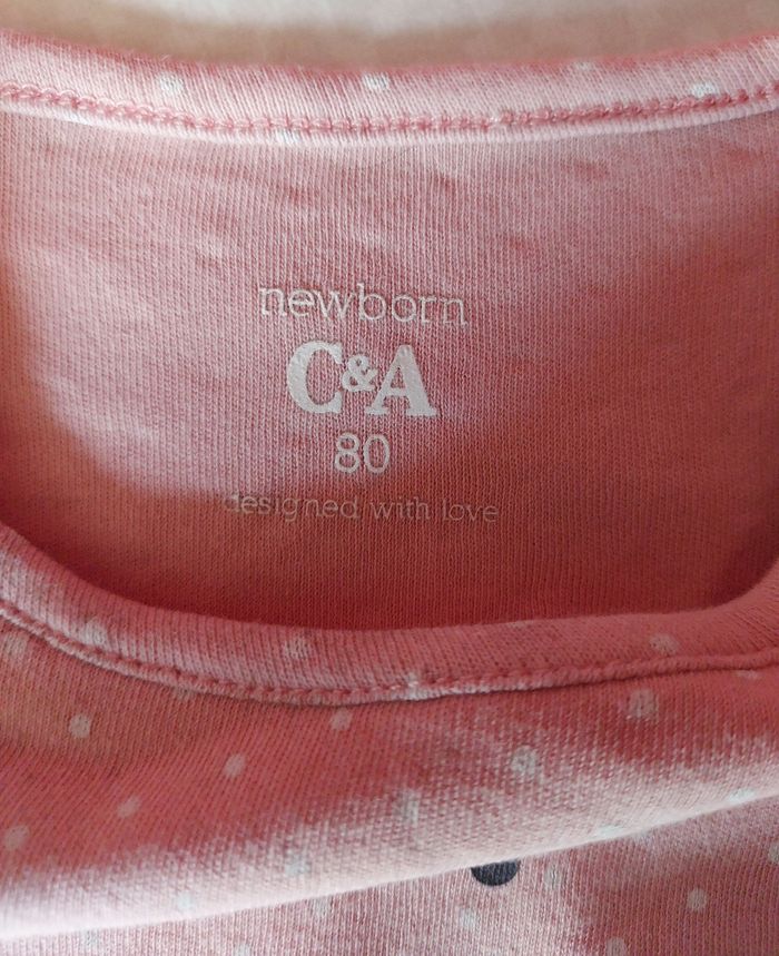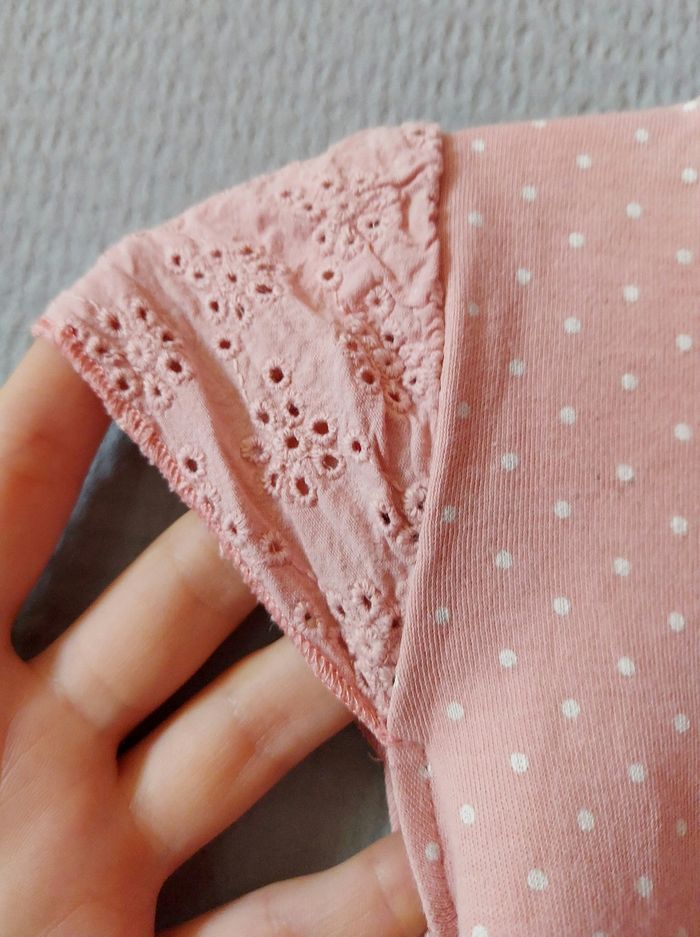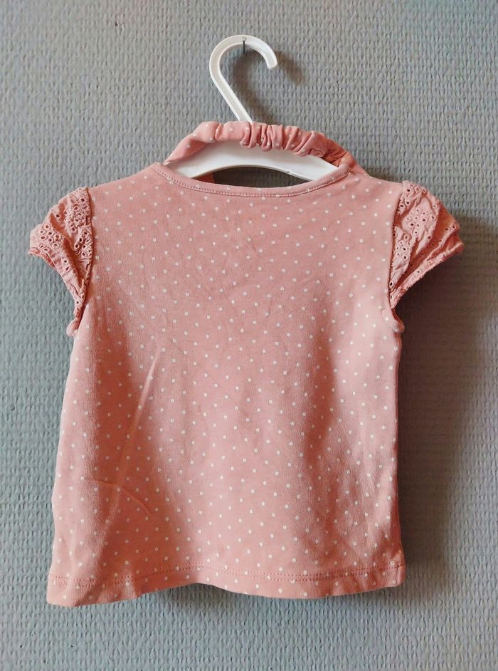 Je vends un t-shirt rose à pois blanc avec un dessin sur le devant- broderie aux manches. Des boutons à pressions sont présents près du cou pour facilité le passage de la tête. Attention : petites tâches sur le devant (voir photo). Reste en bon état. Vendu avec le bandeau assorti- broderie sur le noeud- en très bon état. Vient de chez C&A. Taille : 80 (12 mois).