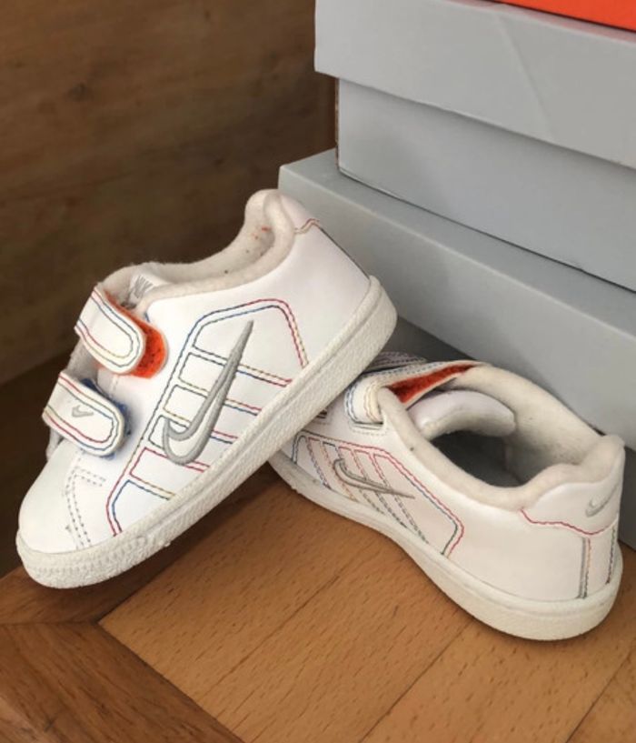 Basket Nike enfant à scratch, en cuir blanche avec des détails bleu orange .. Taille 21, 11 cm . En bon état .