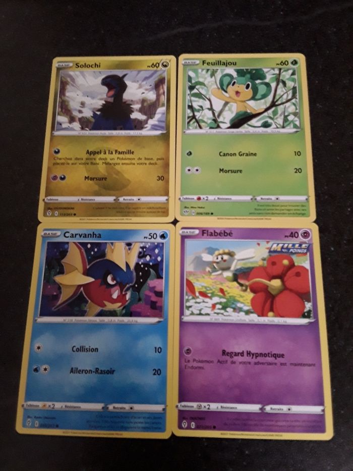 Solochi + Feuillajou + Carvanha + Flabébé lot de 4 cartes Pokémon neuves