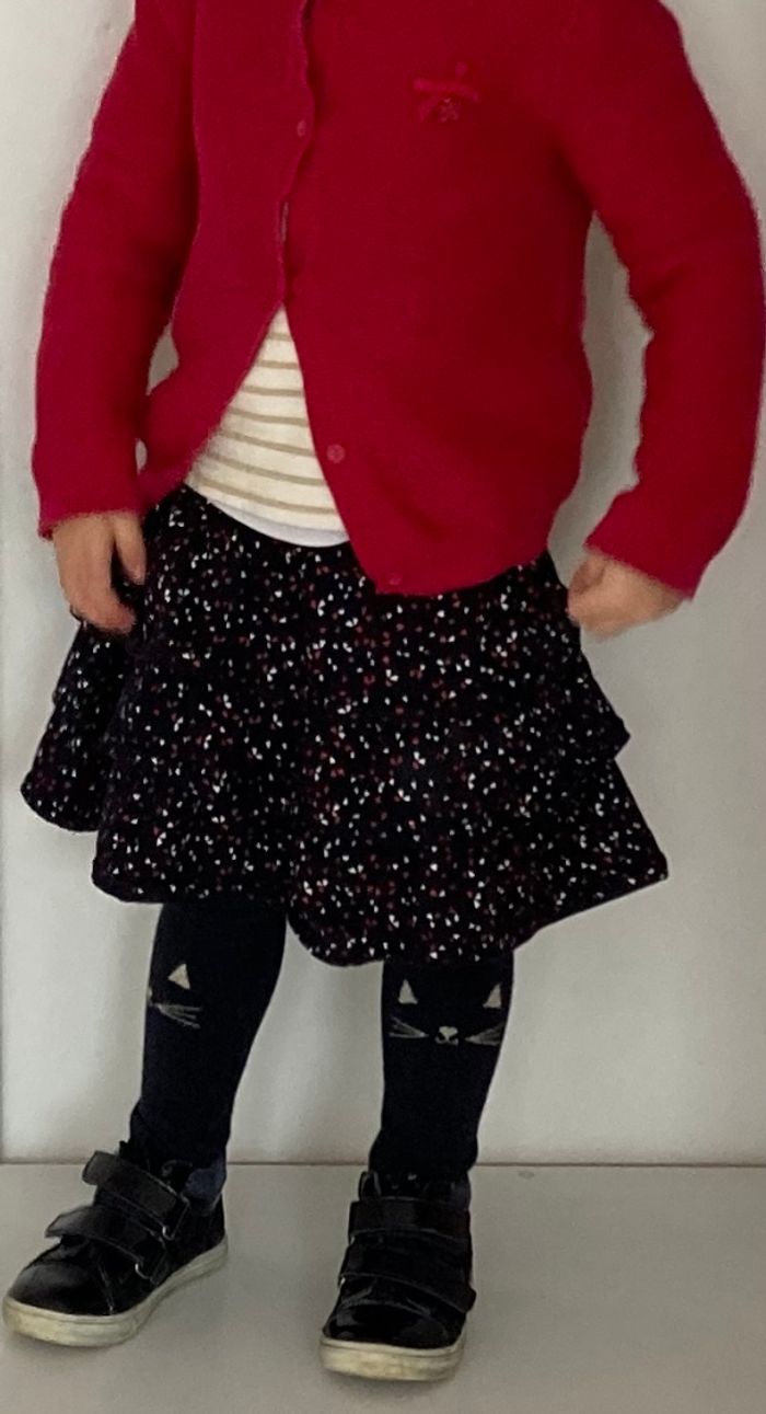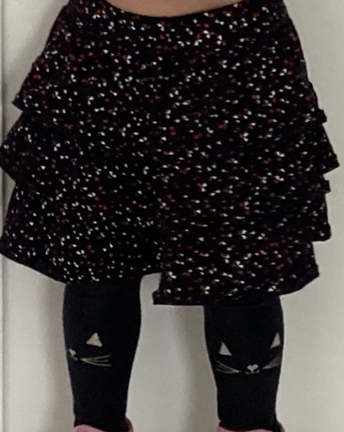 Jupe portefeuille â volants noire à pois blancs et rouge. Excellent état. 4 ans.