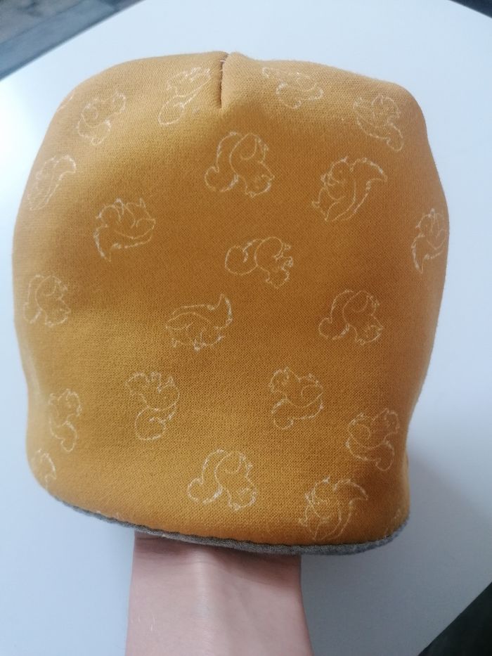 Bonnet hiver réversible, jaune moutarde, écureuils. Taille 8ans/10ans Tour de tête 54cm