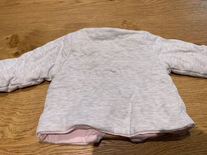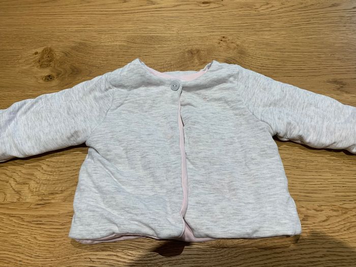 Veste épaisse grise, doublure rose, avec un bouton. Taille : 9 mois (71 cm).