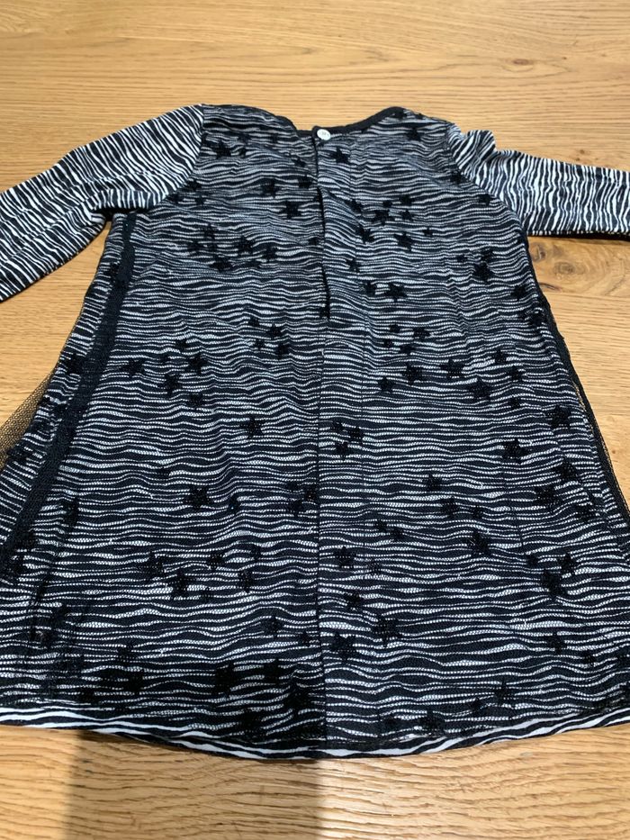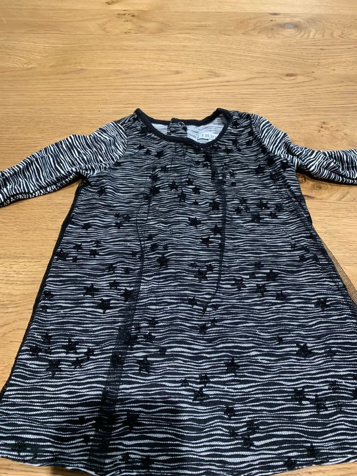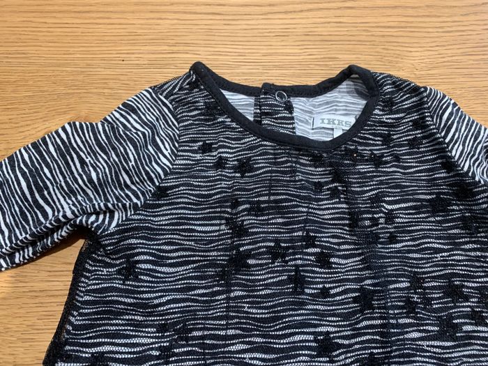 Robe manches longues, rayée noire et blanche (type « zèbre) avec voile à toiles noires par dessus. Excellent état. Taille : 12 mois (74 cm).