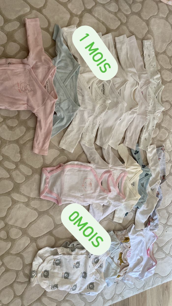 Lots de 36 pieces : 8 bodys manches longues 1 mois 6 bodys manches longues 0 mois 5 bodys manches courtes 0 mois ( inextenso , c&a , orchestra ) 4 pyjamas 0 mois 50cm 8 pyjamas 1 mois 54-56cm ( inextenso , orchestra , ) 4 bodys pyjamas Vertbaudet 3 mois motif fruits. ETATS: SATISFAISANT A BON