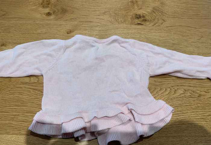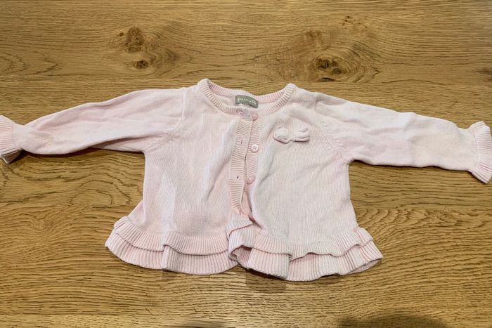 Gilet rose pale, manches longues, a boutons. Taille : 6 mois.