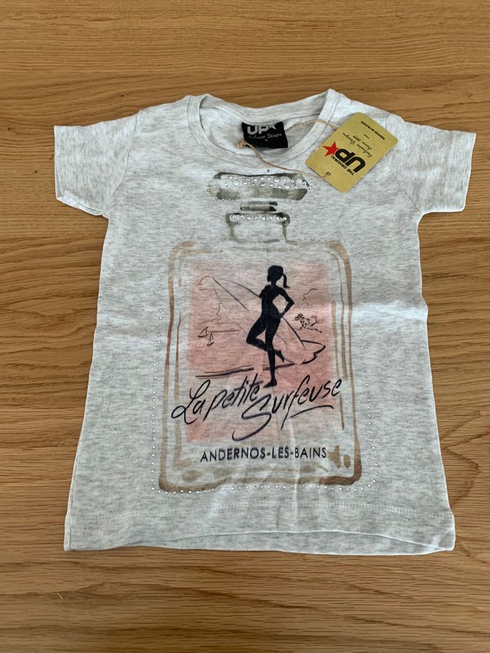 T-shirt gris à manches courtes, de la ville d’Andernos les Bains. Neuf, jamais porté. Taille : 2 ans.