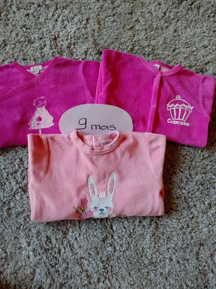 A vendre pyjama en taille 9 mois, je met les 3 pour 2€ car ils présentent tous des signes d'usures. Le 1 er a une tâche, le second est décousu au niveau d'un pied, et le 3eme est usé au niveau des pieds. Ils peuvent malgré tout être porté.