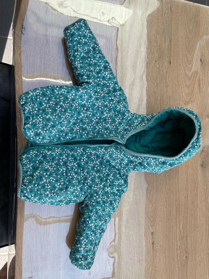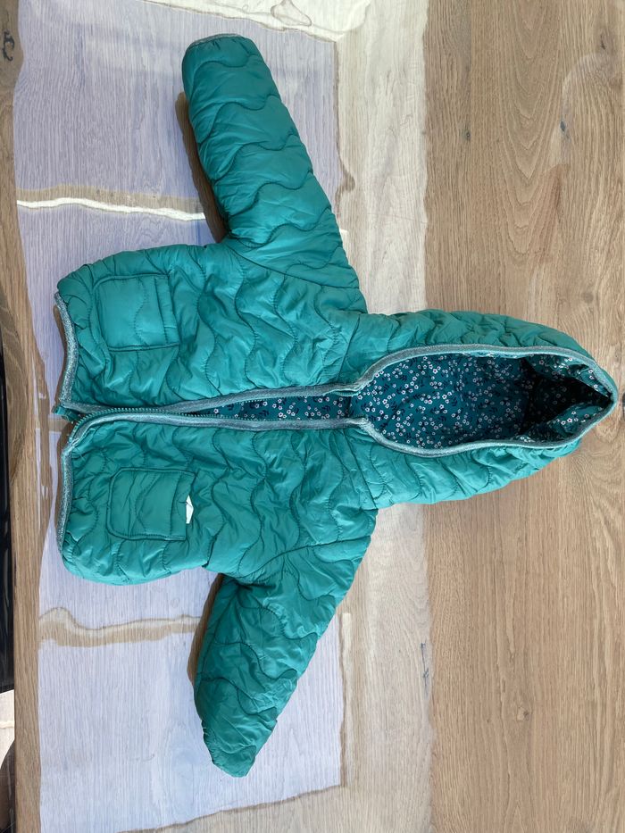 Veste réversible verte et à fleur. Bon tenue de la capuche.