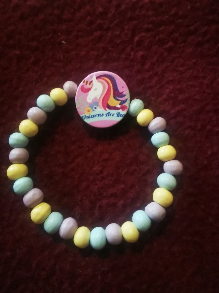 Bracelet Licorne et perles en bois, neuf. Possibilité d'en faire d'autres ou encore de modifier les couleurs. D'autres modèles de licornes sont disponibles