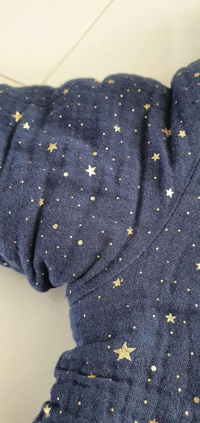 Bleu avec des étoiles dorées. Capuche. Fermeture par pression