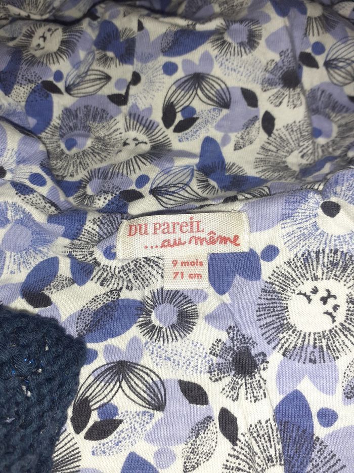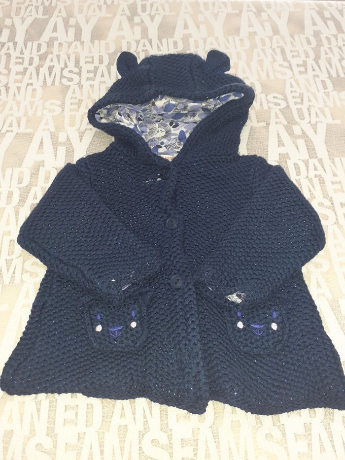 Manteau bleu marine 9 mois. En bon état malgré le défaut au niveau du bouton, voir photo. A recoudre éventuellement, mais n'empêche pas d'être porté. Marque Du Pareil Au Même.