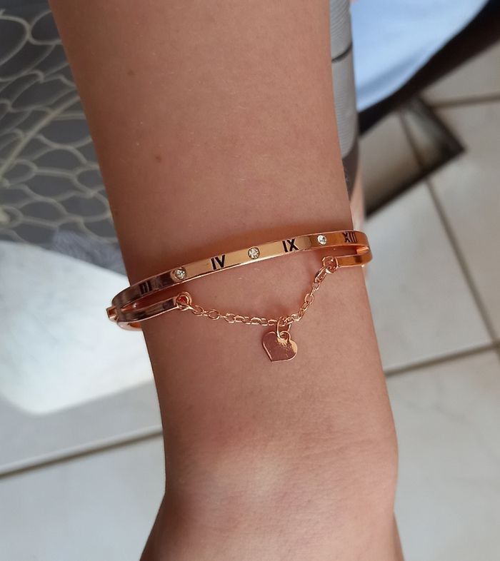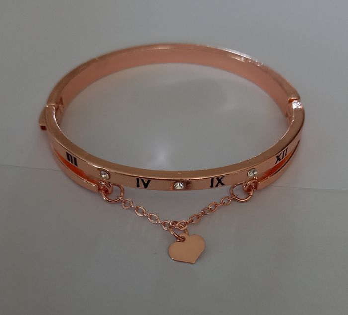 Bracelet chiffres romains coloris or rose et strass. Chainette avec petit cœur. Tour de poignet maxi : 17 cms. Bracelet neuf sous blister. N'hésitez pas à regarder mes autres ventes. Envoi rapide et soigné.