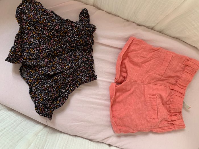 🌸 Lot de 2 shorts 🌸 Taille 3 mois 🌸 Parfait état, ils n’ont été porté qu’une fois chacun. 🌸 short fleuri de la marque « Kiabi » et le short rose/corail est de la marque « TEX Baby ».