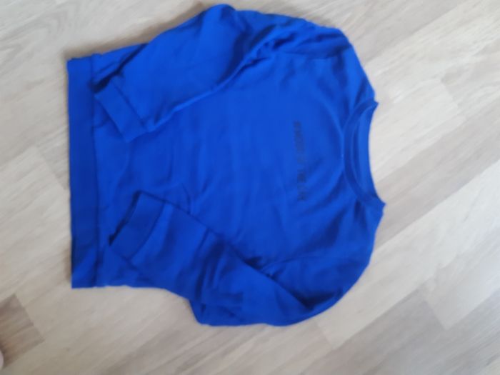 Bonjour, Je vends un sweat bleu en 8 ans. Très peu porté.