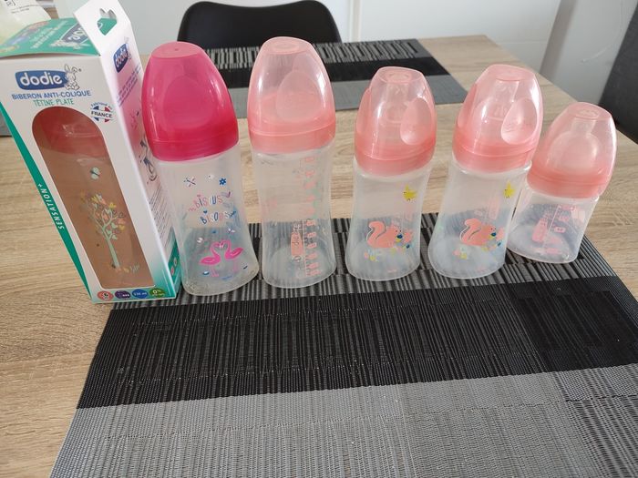 Vend lot de 6 biberons DODIE sans les tétines car utilisées. Sauf un dans la boîte neuf.