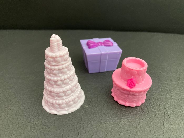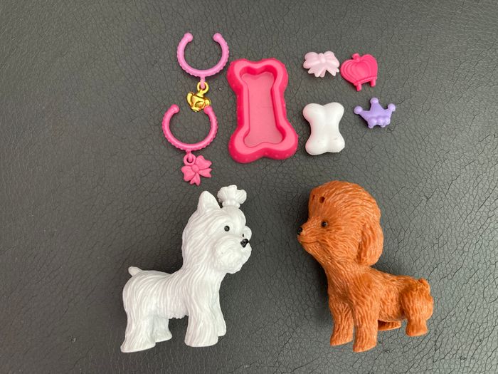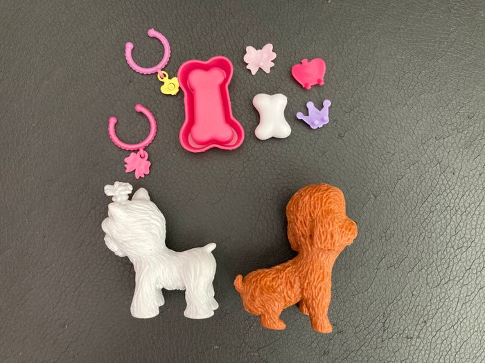 Ensemble de figurines : Petshop : - 1 jeune fille et son sac à main - 2 gâteaux d’anniversaire - 1 cadeau Autres : 2 chiens et leurs accessoires : - 1 miroir sur socle, - 1 gamelle et - 1 os, - 3 bijoux de tête - 2 colliers Excellent état #figurinespourenfant #petshop #petshops #figurinechien #figurineschiens