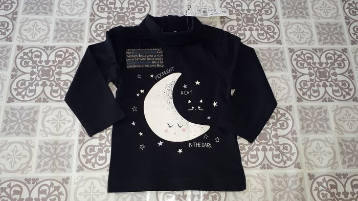 Ouverture intégrale par pressions au dos. Col roulé . La lune brille dans le noir. Egalement dispo en 12 mois, 1 autre haut et un ensemble robe, n'hésitez pas, prix sur les lots.