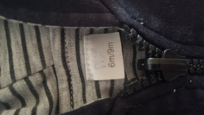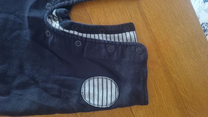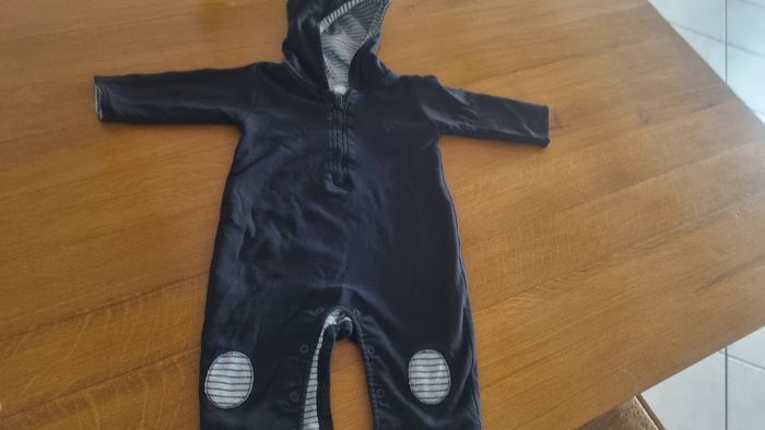 Combinaison coton ou surpyjama. Avec capuche, fermeture par des pressions à l'entre jambe, marine. Marque inconnue, taille 6/9mois.