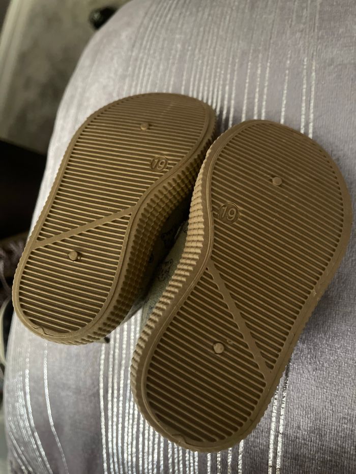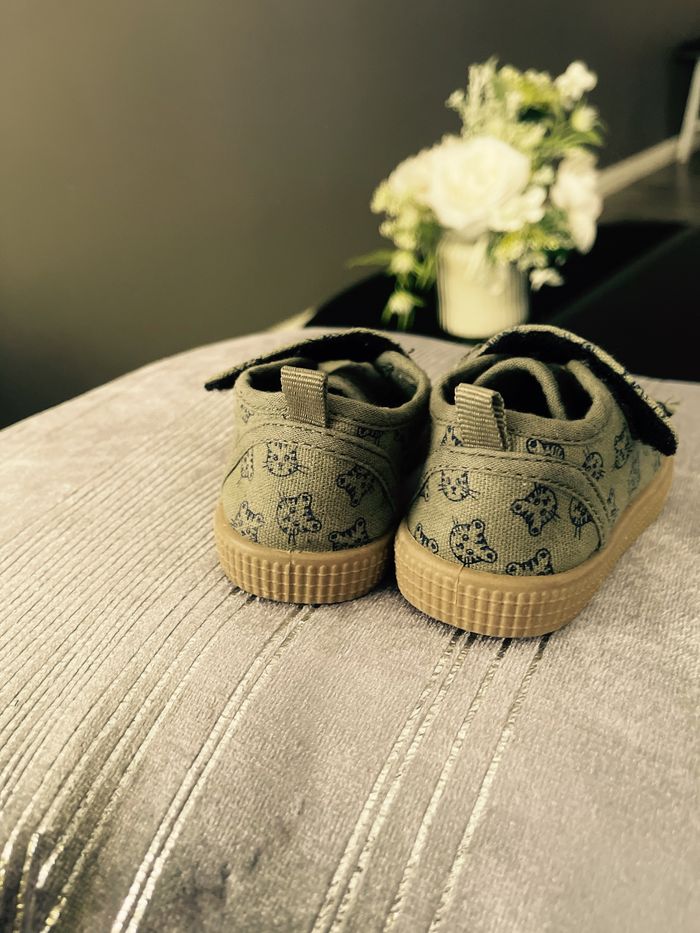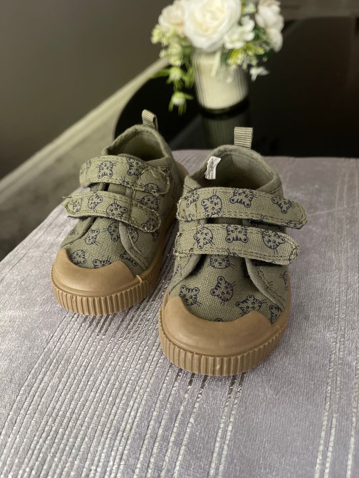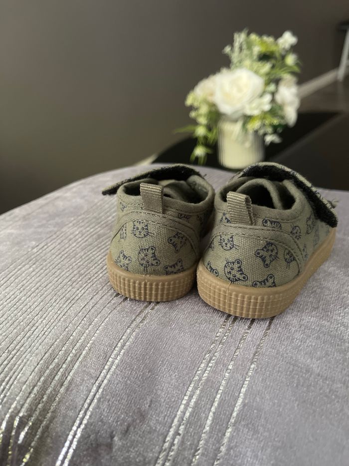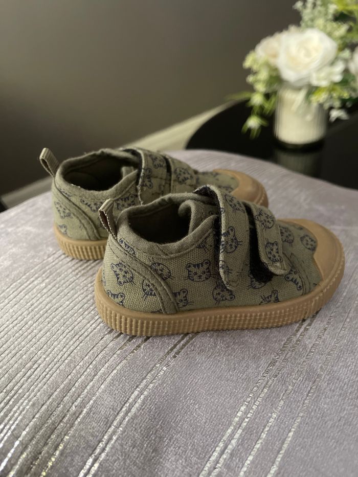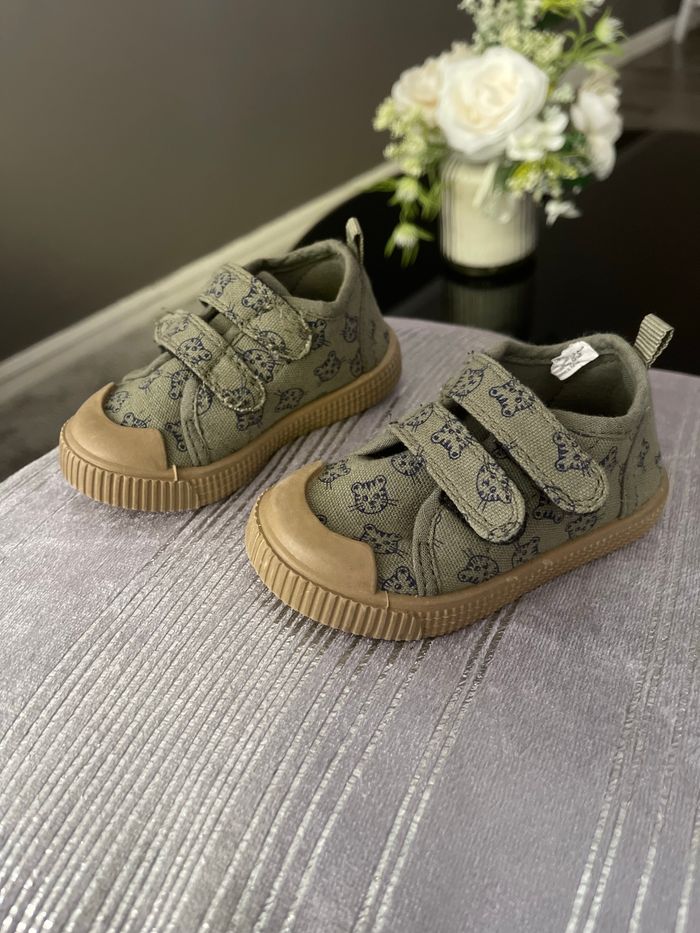 En excellent etat, tres peu porter. Basket à scratch de coloris kaki, avec des motifs petit tigres. Taille 19.