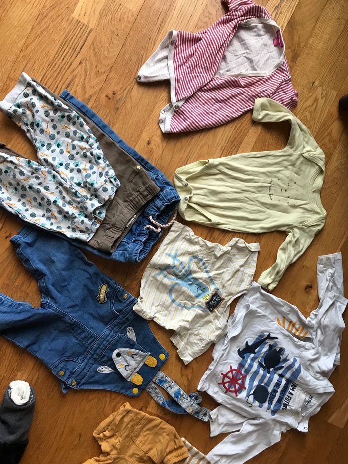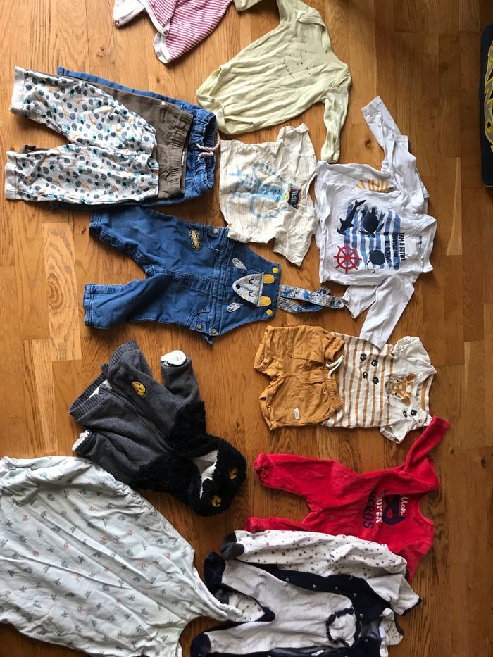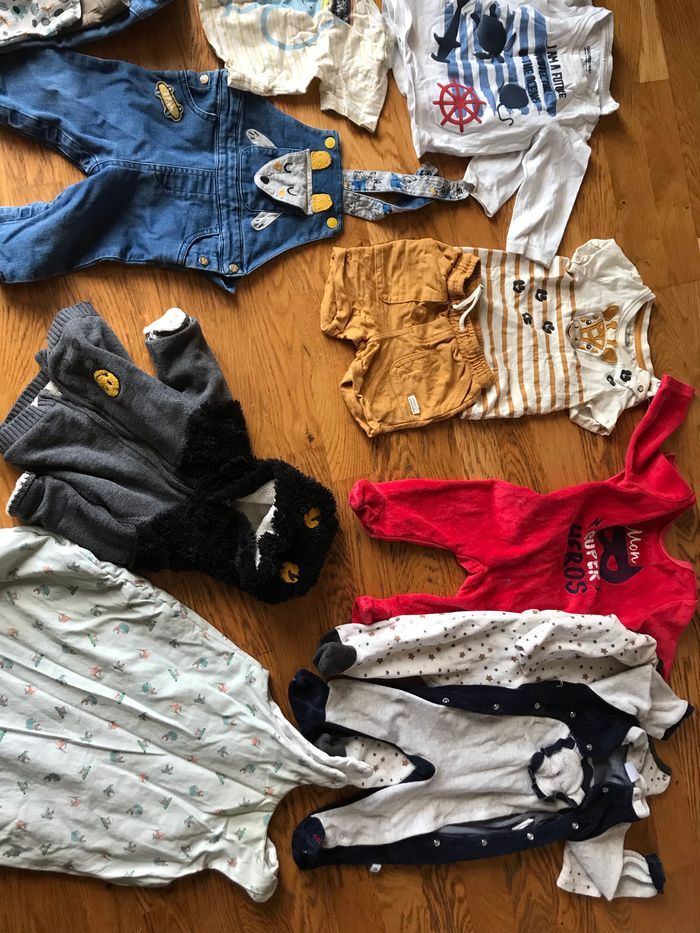 Vêtements bébé 6 mois inter-saison, bon état mais quelques taches : 1 body manches courtes 1 body manches longues 3 pantalons 3 pyjamas 1 turbulette 2 tee-shirts manches courtes 2 tee-shirts manches longues 1 pull 1 short 1 salopette