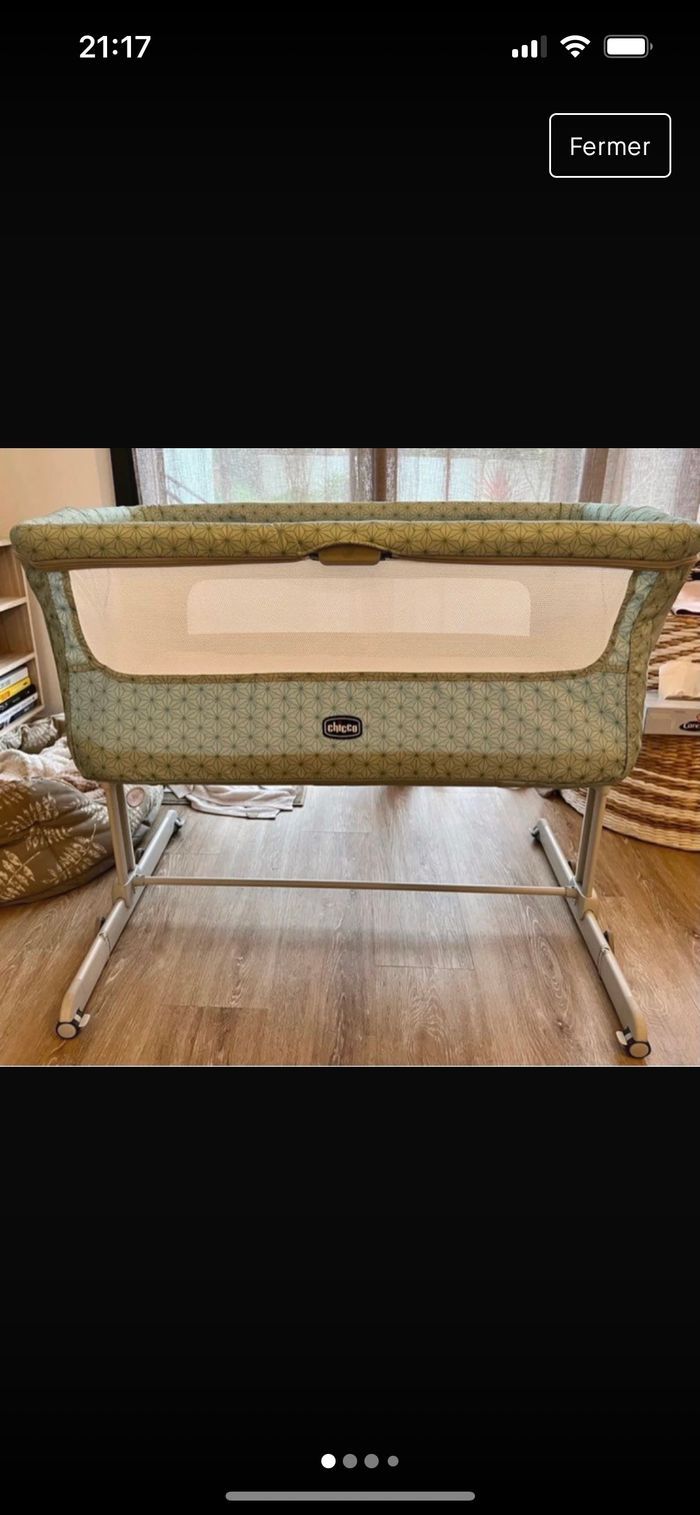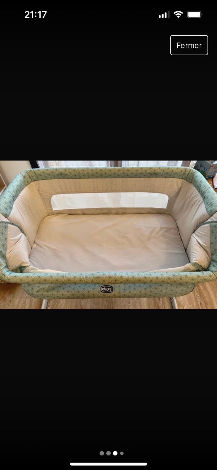 Berceau cododo avec matelas et 2 protégés matelas , mode bascule, un côté repliable, hauteur réglable , possibilité d’incliner un côté, fenêtre en filet, roue et sac de voyage. 0-6 mois Très bon état, ni taché ni abimé, protège matelas pas tachés et très peu servi