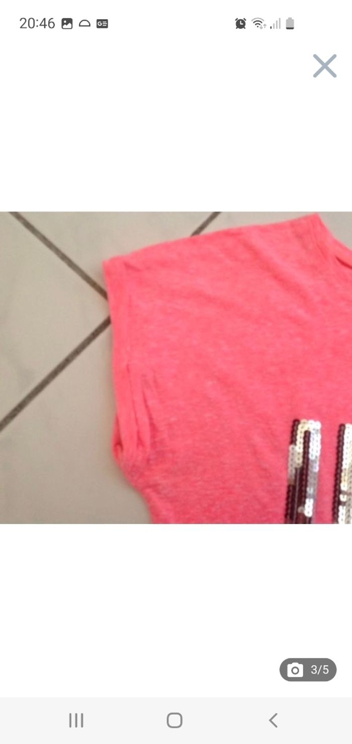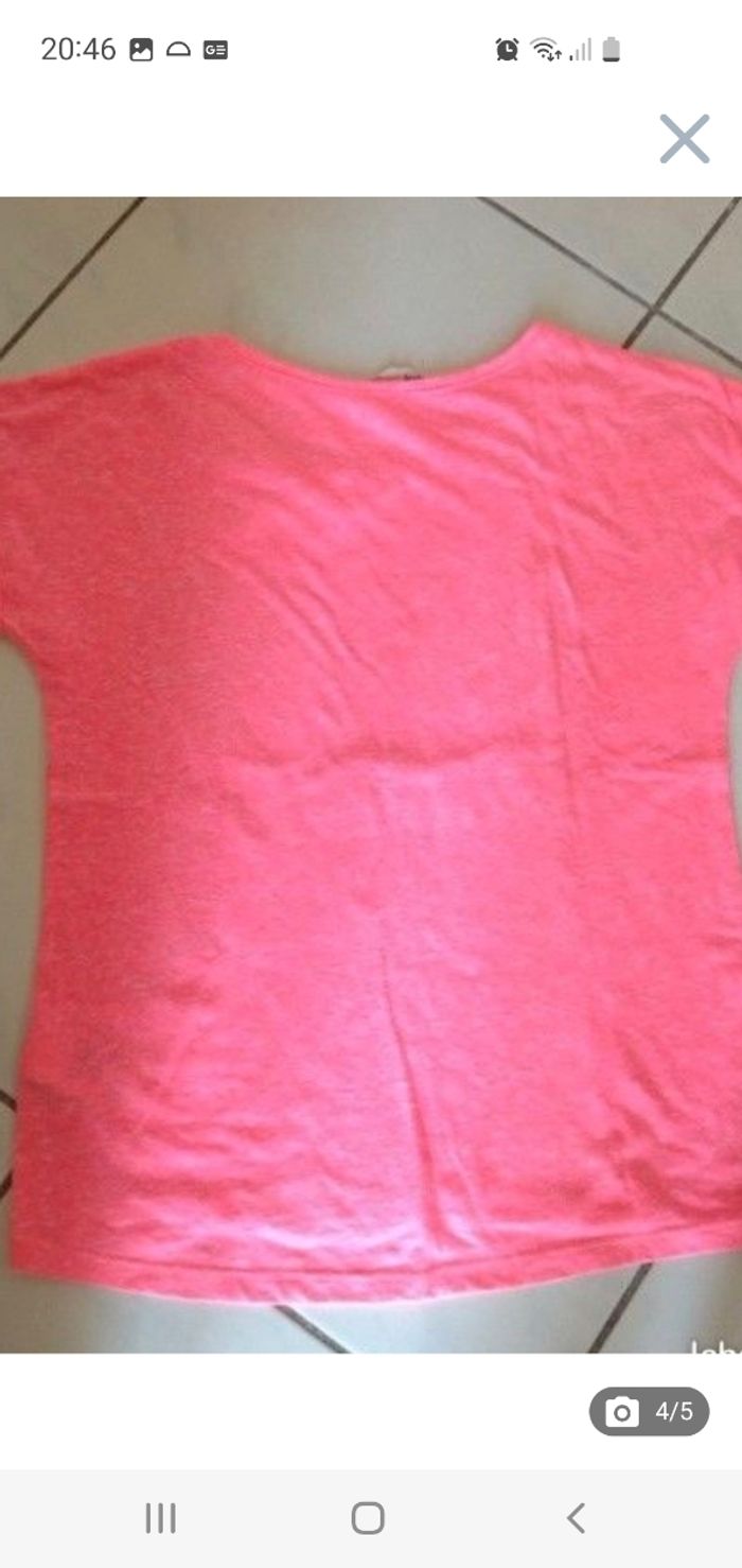 Vends tee-shirt, manches très courtes, de couleur rose fluo avec impression strass sequins sur le devant. Marque H&M, taille 10-12 ans US, taille 146/152 EUR. Excellent état.