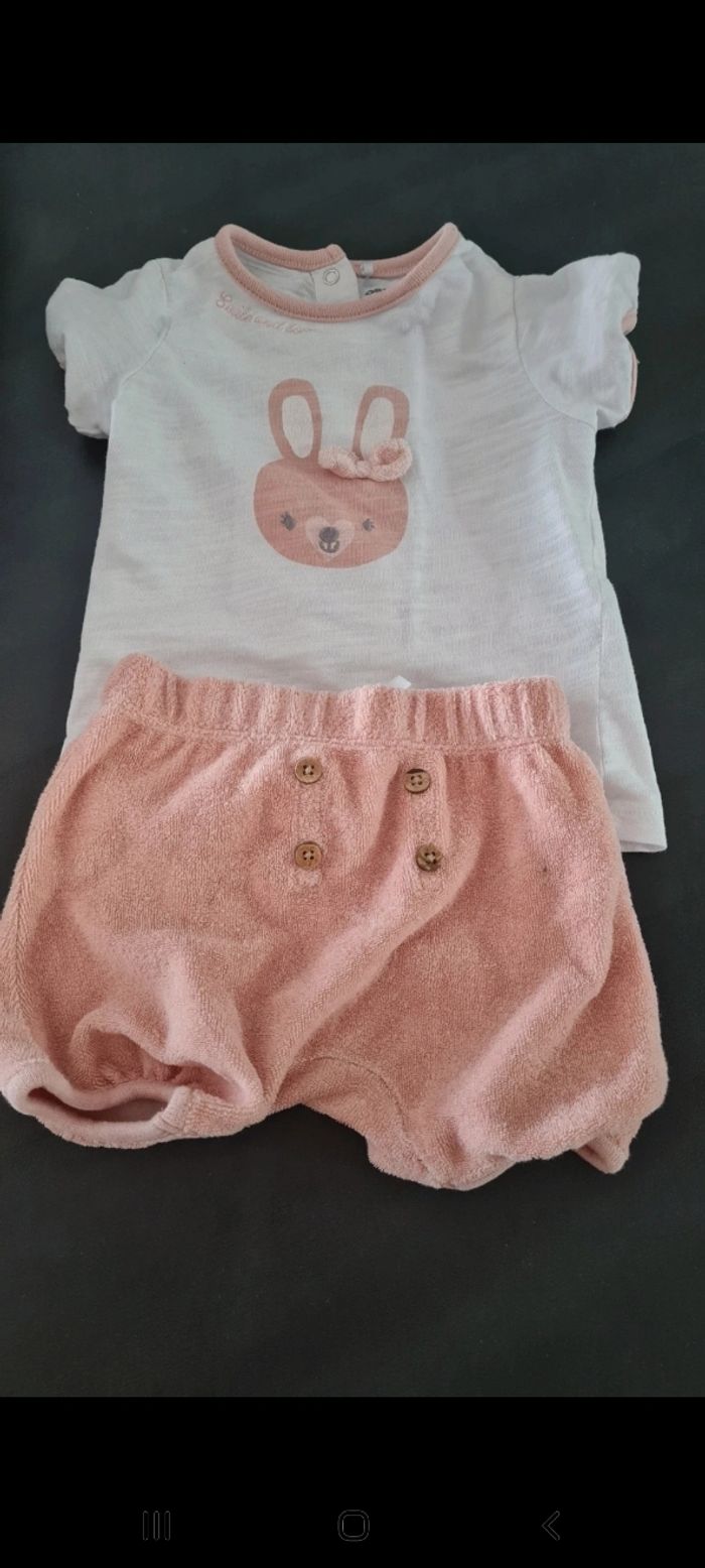 Short et tee shirt bebe fille matière légère. Taille 6 mois, en très bon état. Corail, avec motif petit lapin 🐰