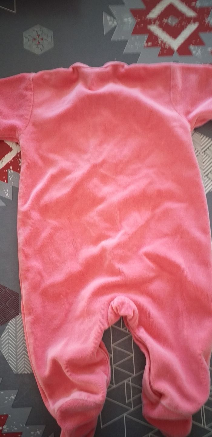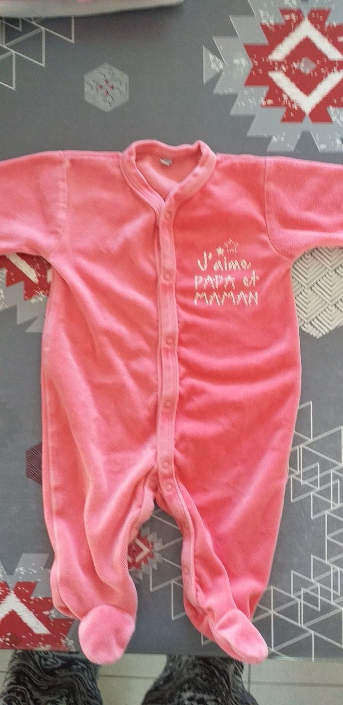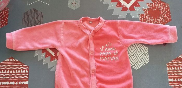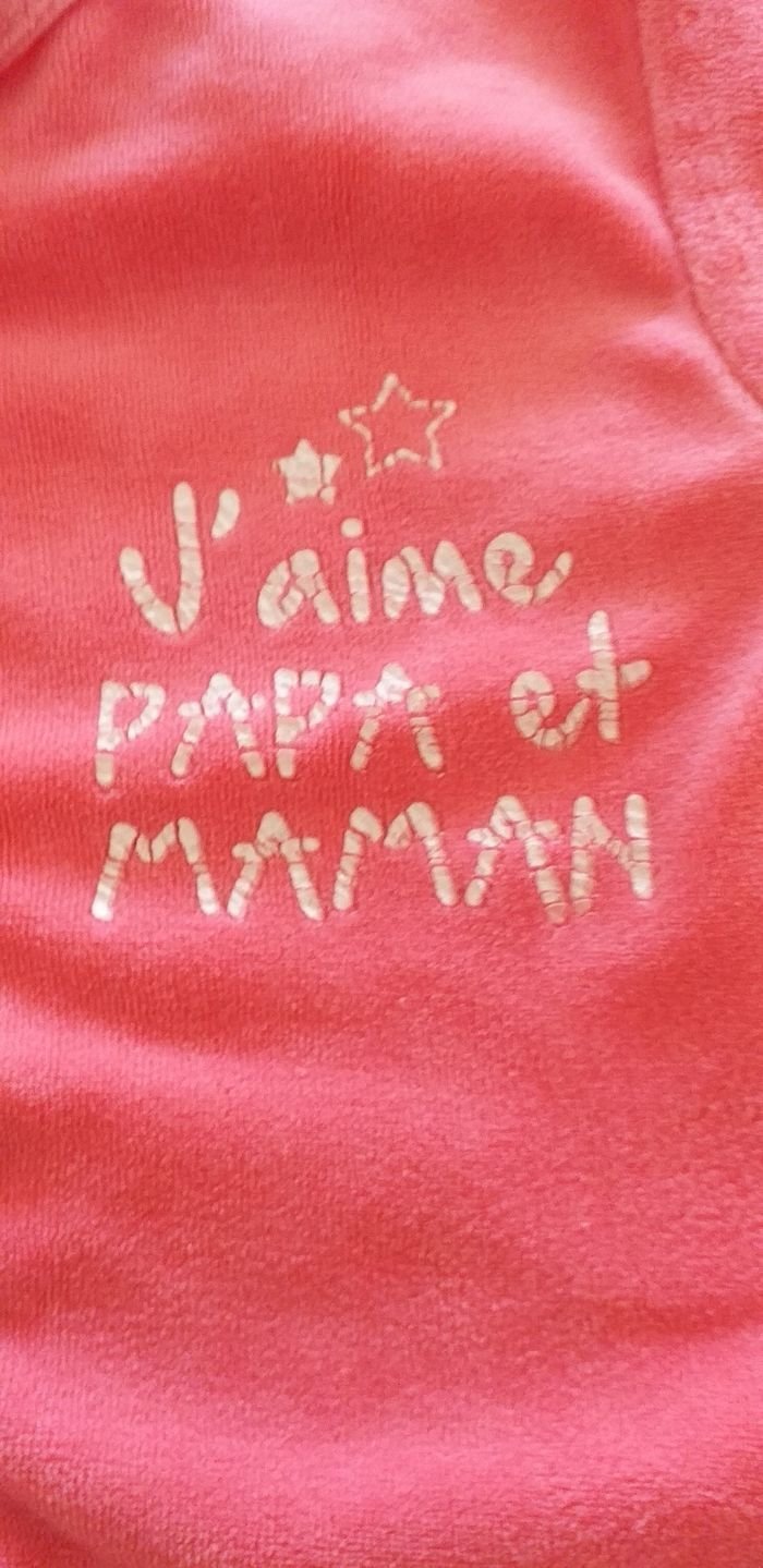 Porté plusieurs fois. Pyjama avec écriture j'aime papa et maman qui est craquelée. Fermeture par devant. Taille 6 mois.
