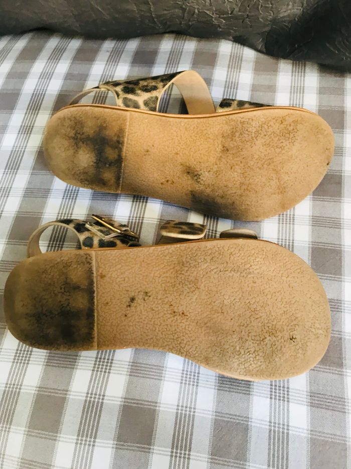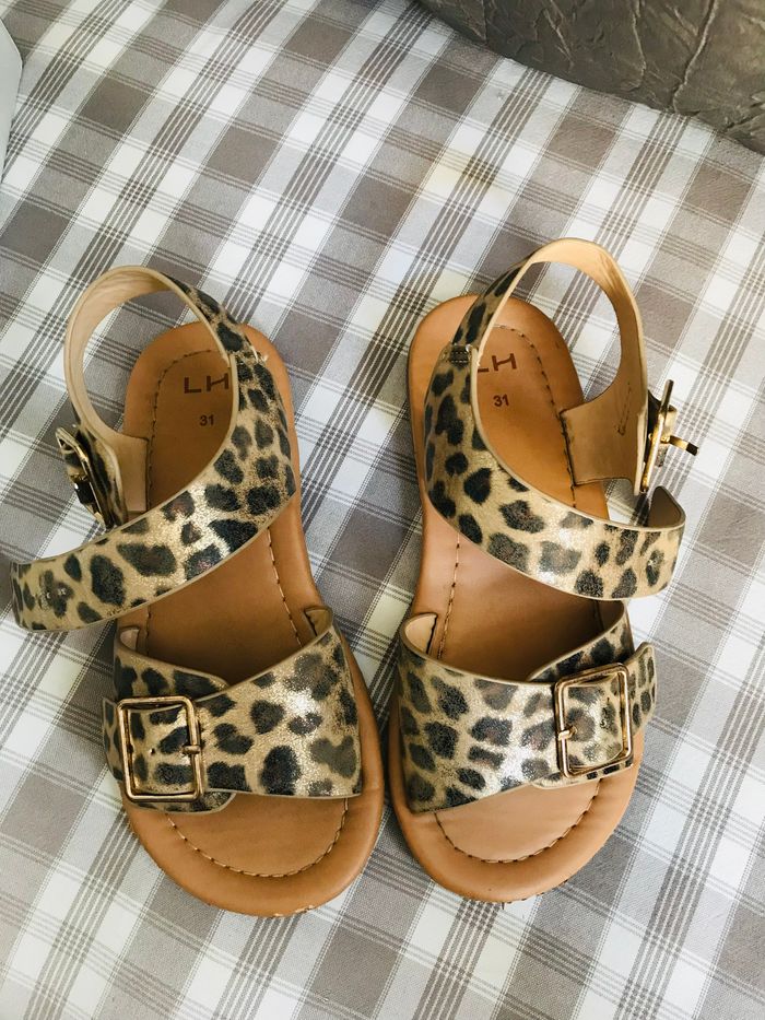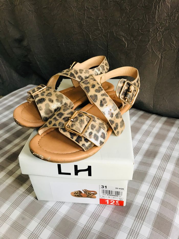 Sandalettes fille taille 31 en bon état. Couleur marron et bronze. Se ferme par sangle ceinture sur le dessus et la cheville. Idéal pour pied fin. Le devant de la semelle est un peu abîmée. De la marque LH (La Halle)
