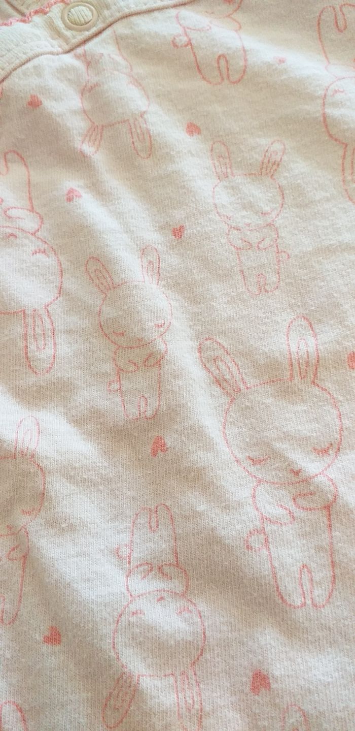 Porté plusieurs fois. Pyjama léger idéal pour l'été. Dessin de lapin sur l'ensemble du pyjama. Fermeture par devant. Taille 6 mois.