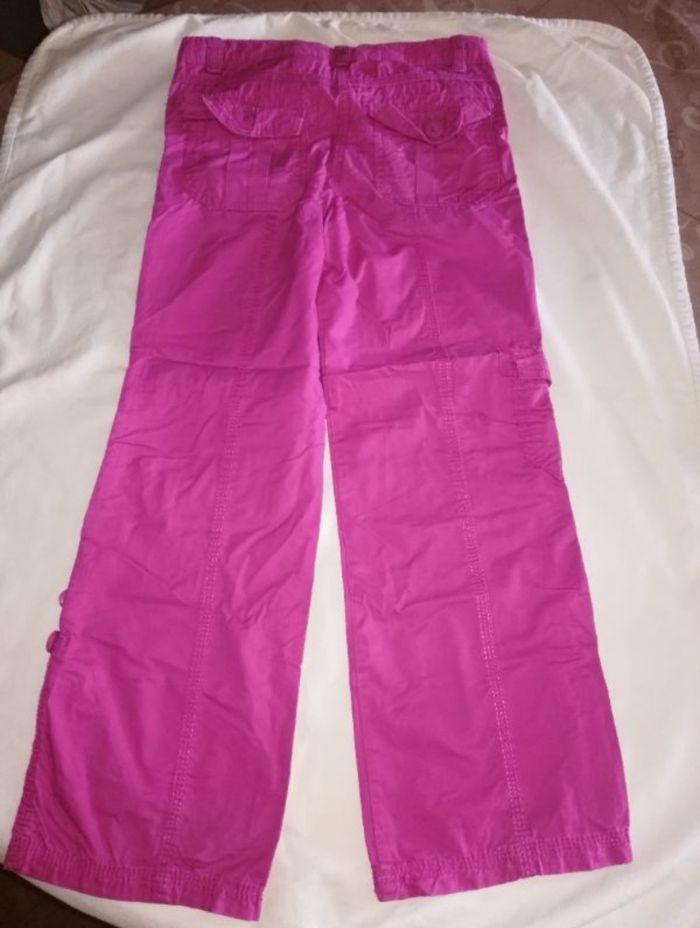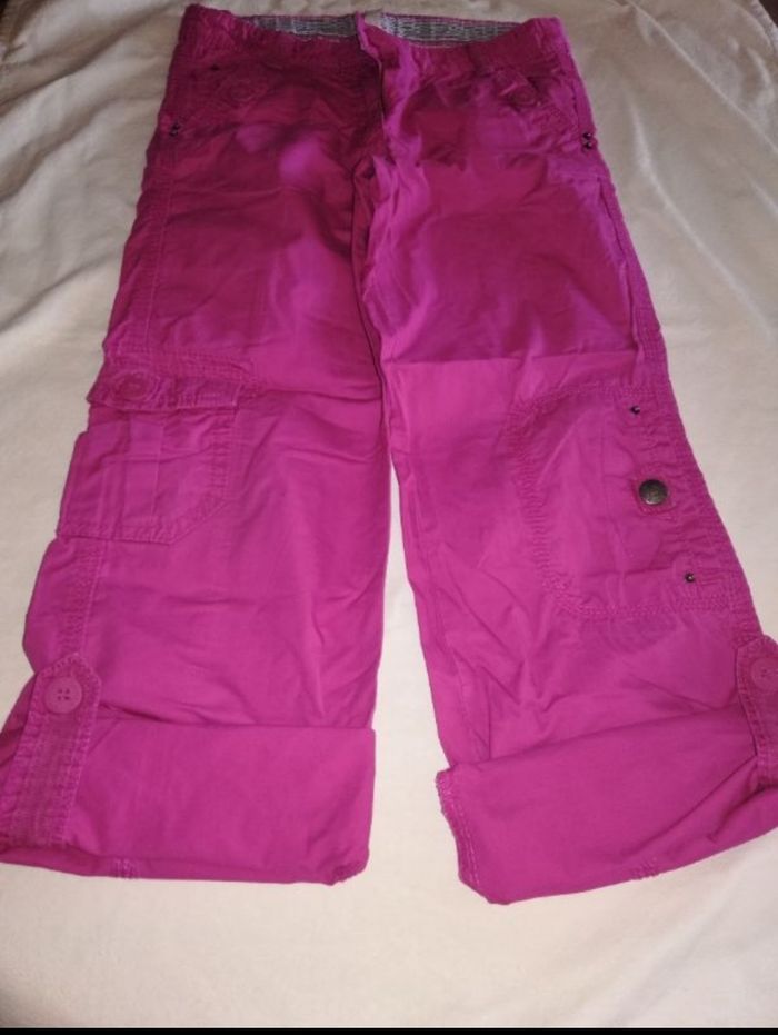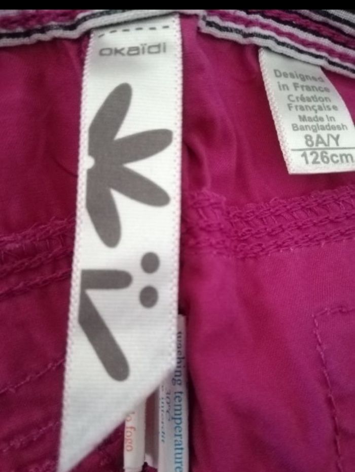 Pantalon,court fille 8 ans, couleur rose fuchsia, très bon état (juste manque 1 bouton poche derrière). Il peut être réglable en pantacourt ou rester en pantalon (voir photos) marque OKAÏDI.