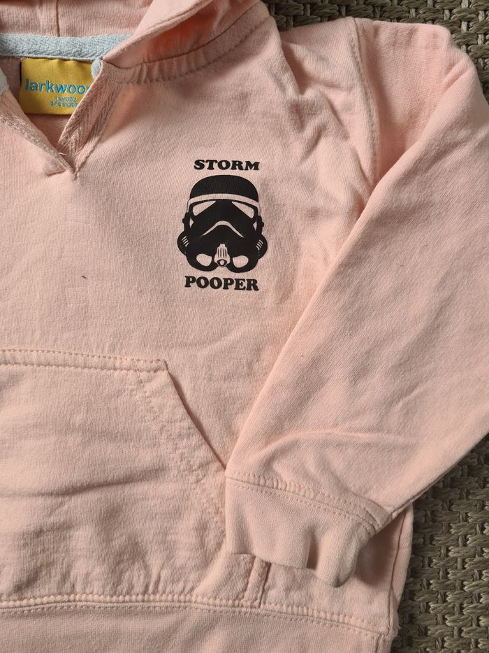 Sweet à capuche "starwars" rose clair. Porté quelques fois mais en bon état. Defaut : 1 tâches peu visible sur la manche (voir photos). Taille 3/4 ans marque larkwood