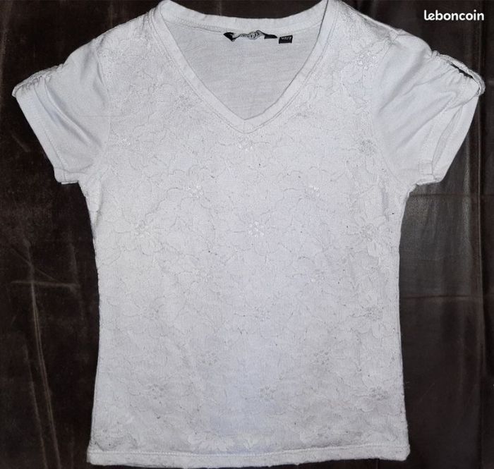 Vends un t-shirt blanc avec aspect dentelle sur le devant en 6 ans propre, lavé, repassé 2 E