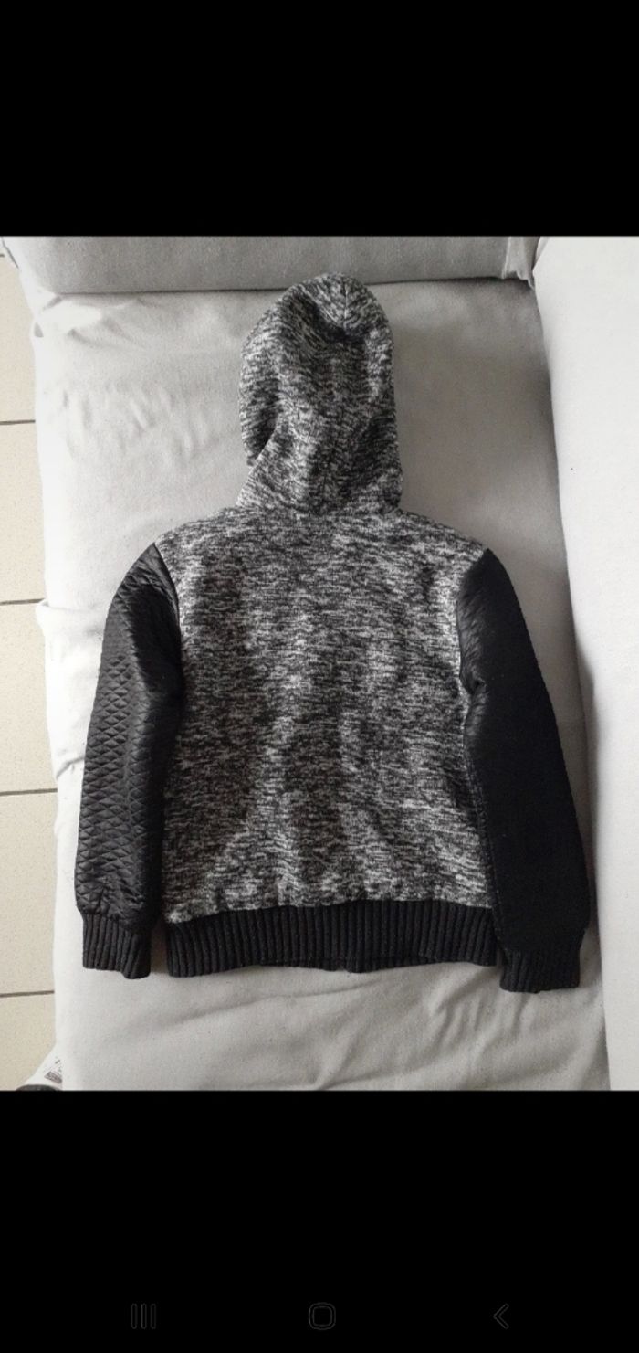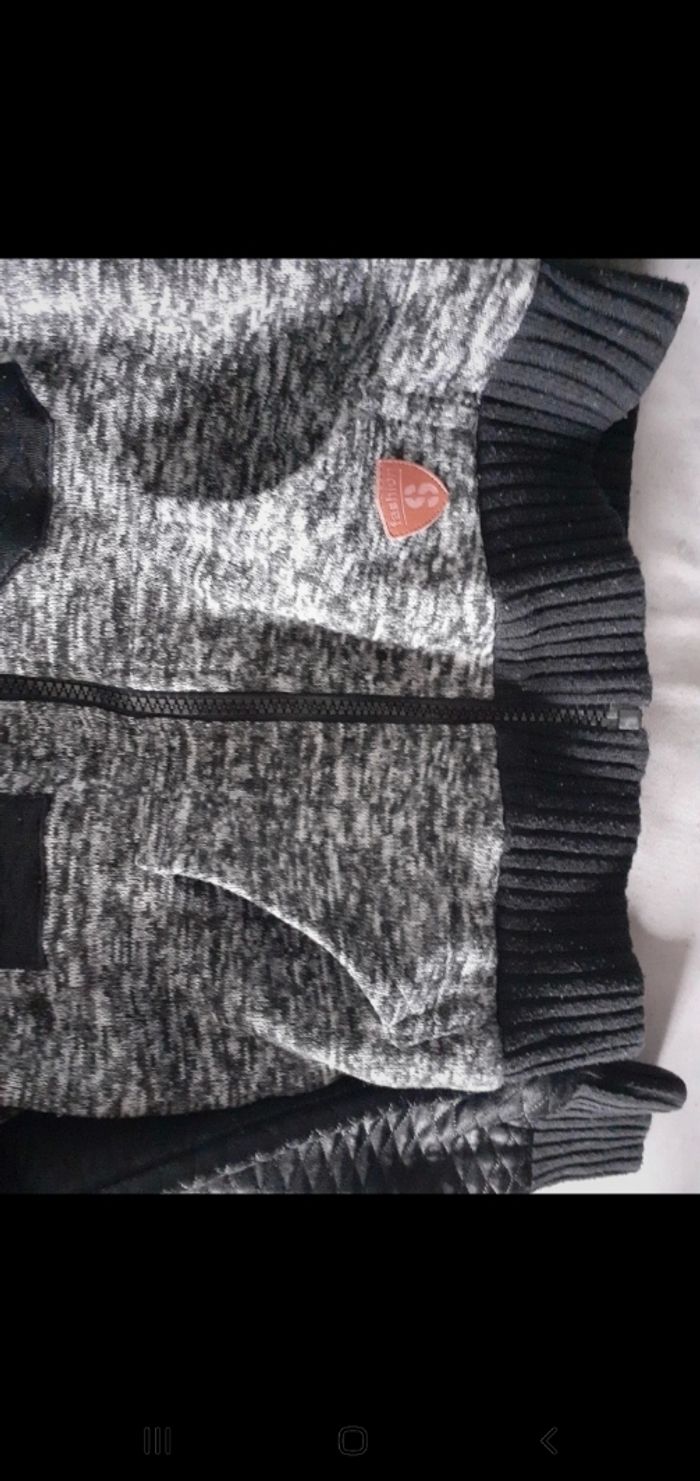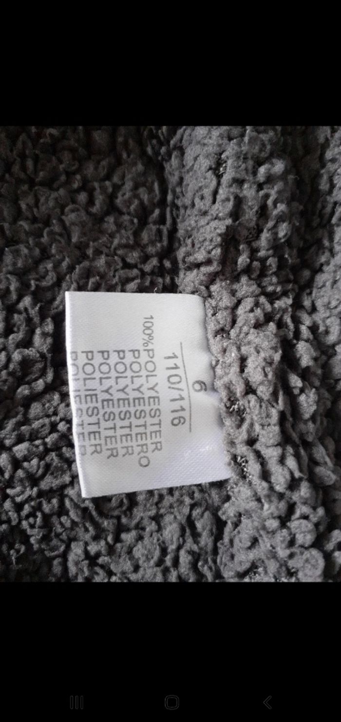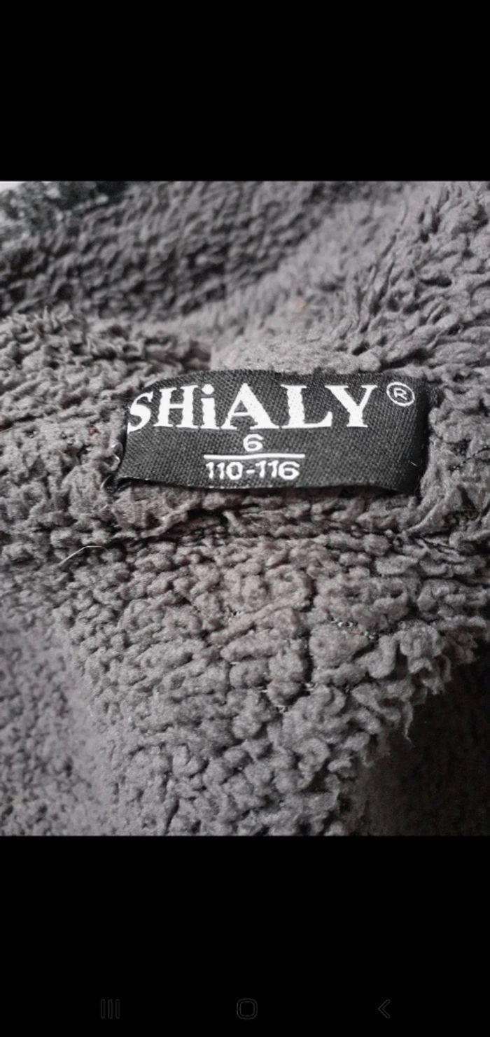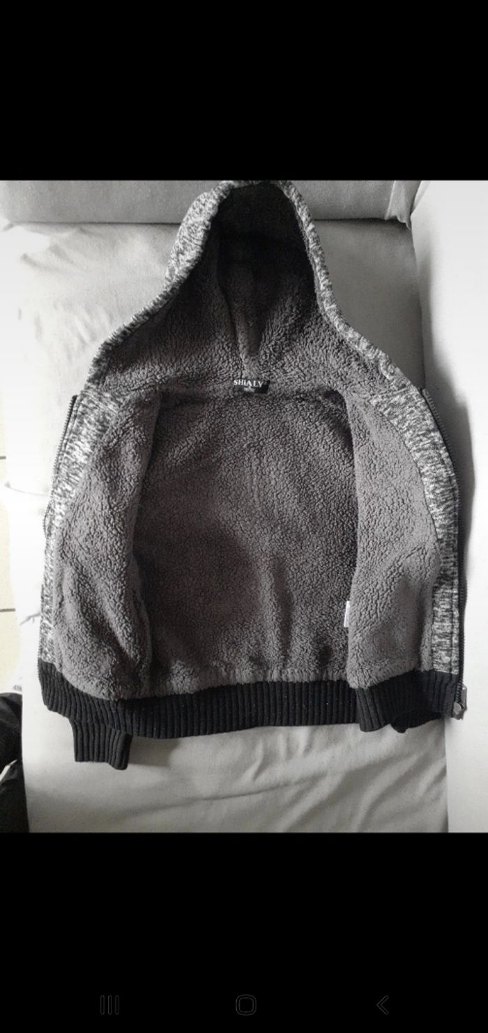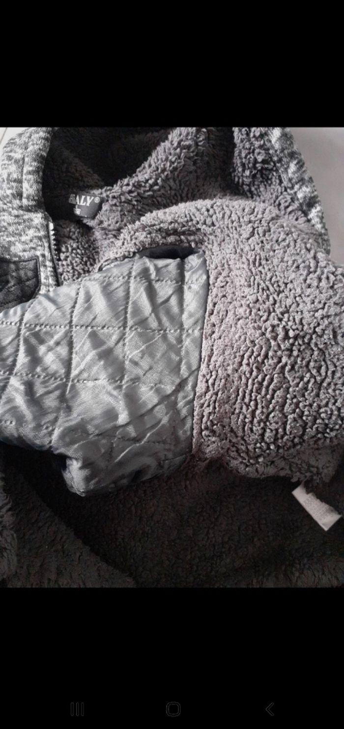 Marque: Shialy. Bien épaisse. Capuche fourré. Ferme avec une fermeture. 2 poches. Intérieur fourré, sauf les manches. Plusieurs bouloches sur les manches et légère entaille. Pas de trou, ni de tâches.