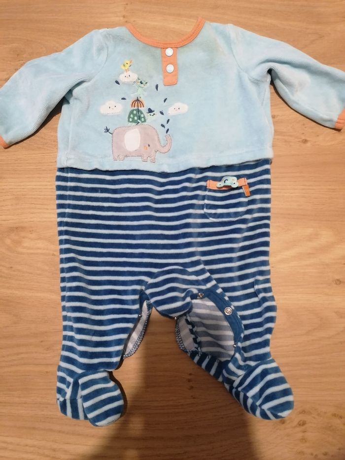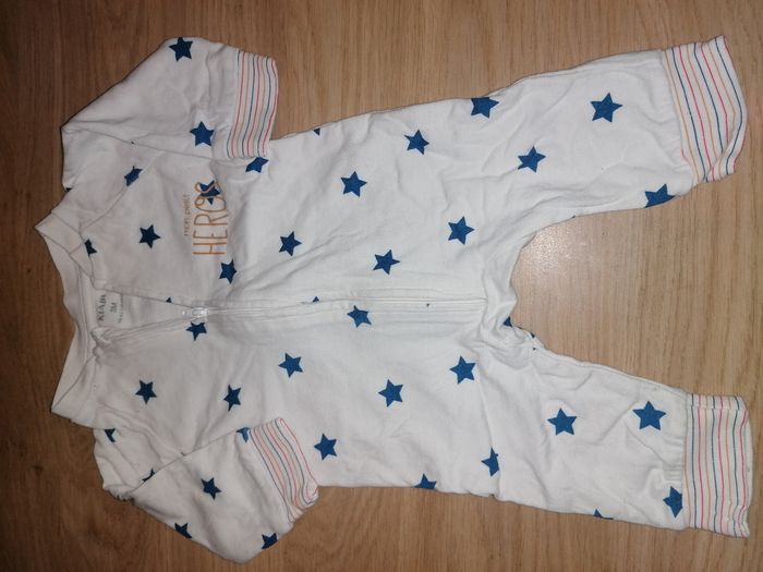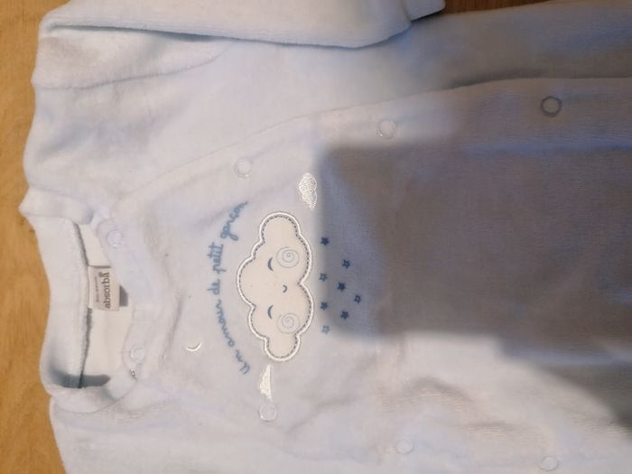 Pyjama zippé avec des étoiles kiabi Bleu ciel avec nuage Absorba Le gris avec écriture sans marque Bleu ciel rayé sergent major Le tout en 3 mois