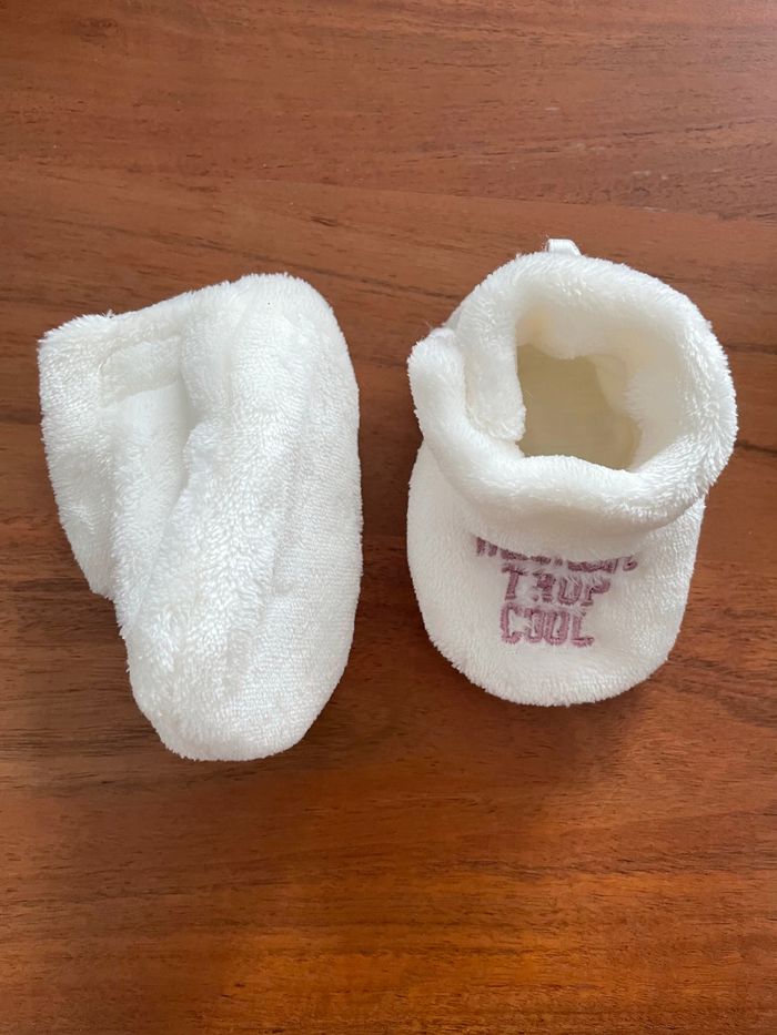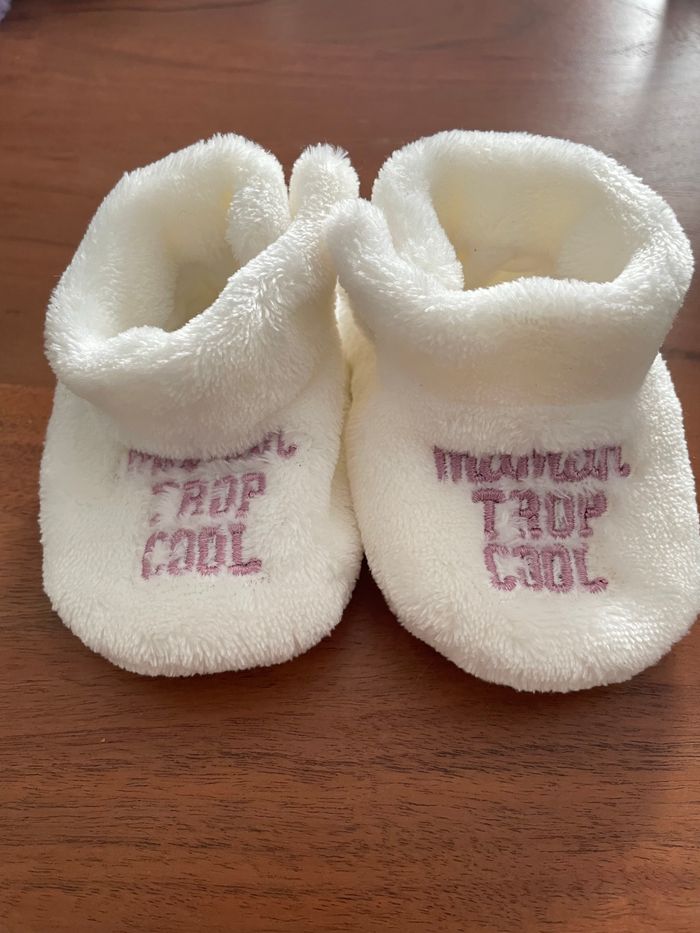 Chausson 3-6 mois, neuf Blanc, écriture rose « maman trop cool » Fermeture à scratch